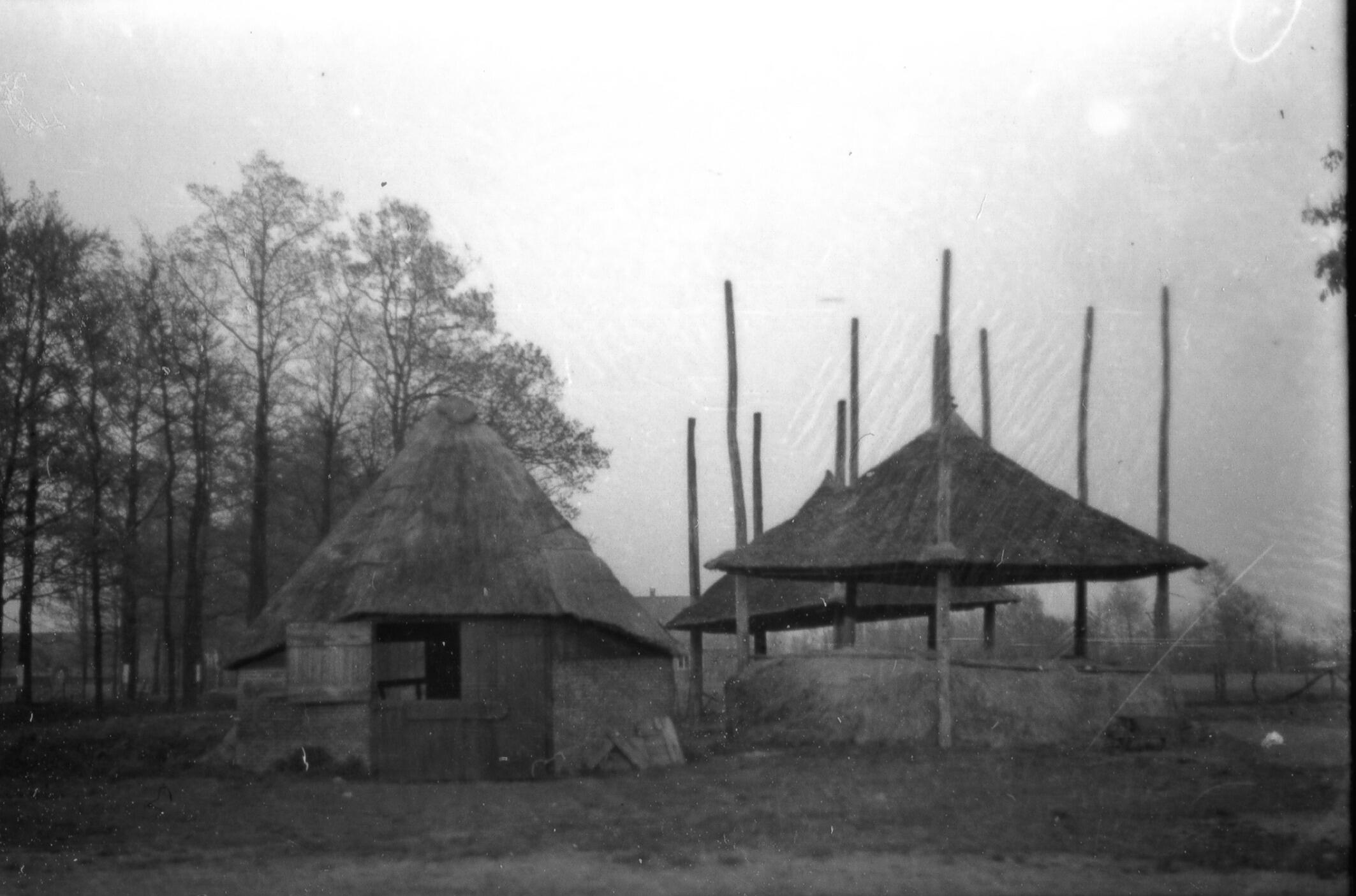 Schaapskooi en hooibergen, Ede, 1938 (zwart-wit foto)