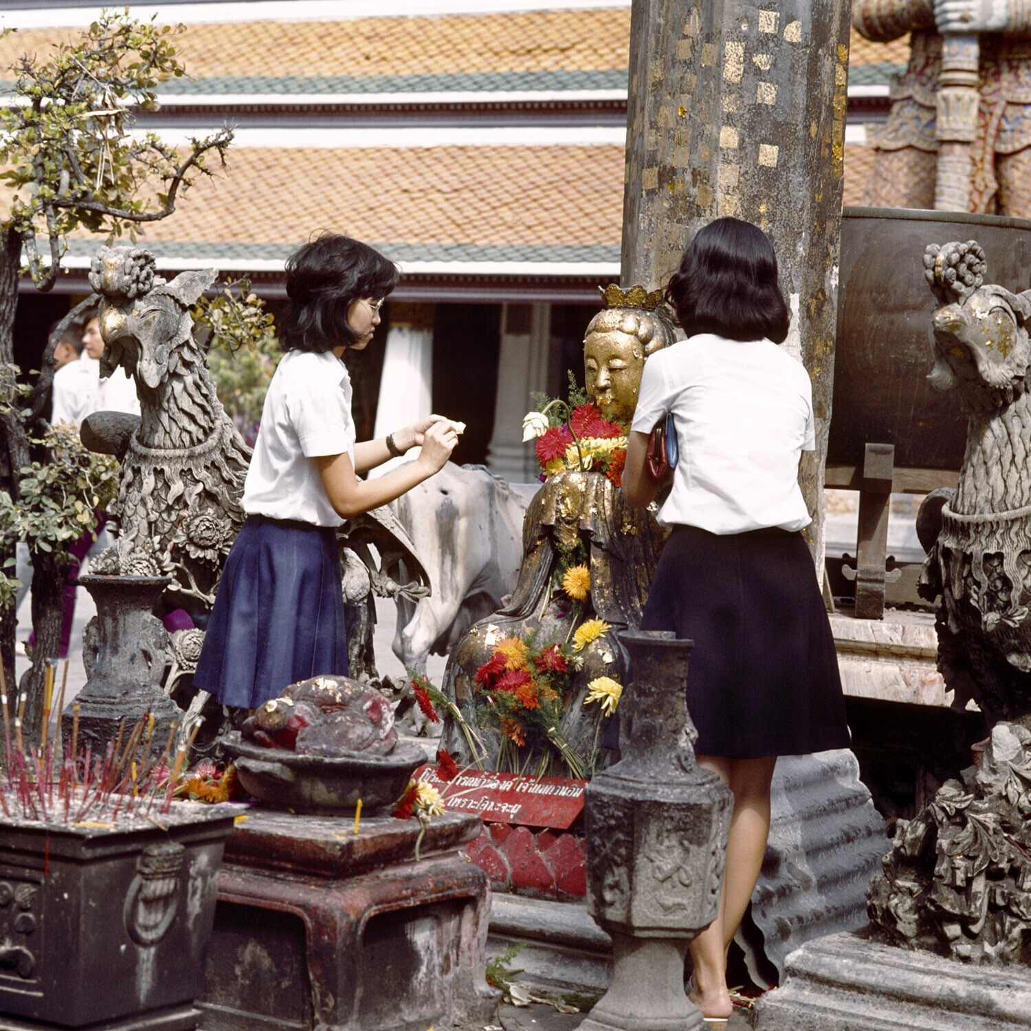 Het offeren van oa, bloemen, kaarsen en wierookstokj...