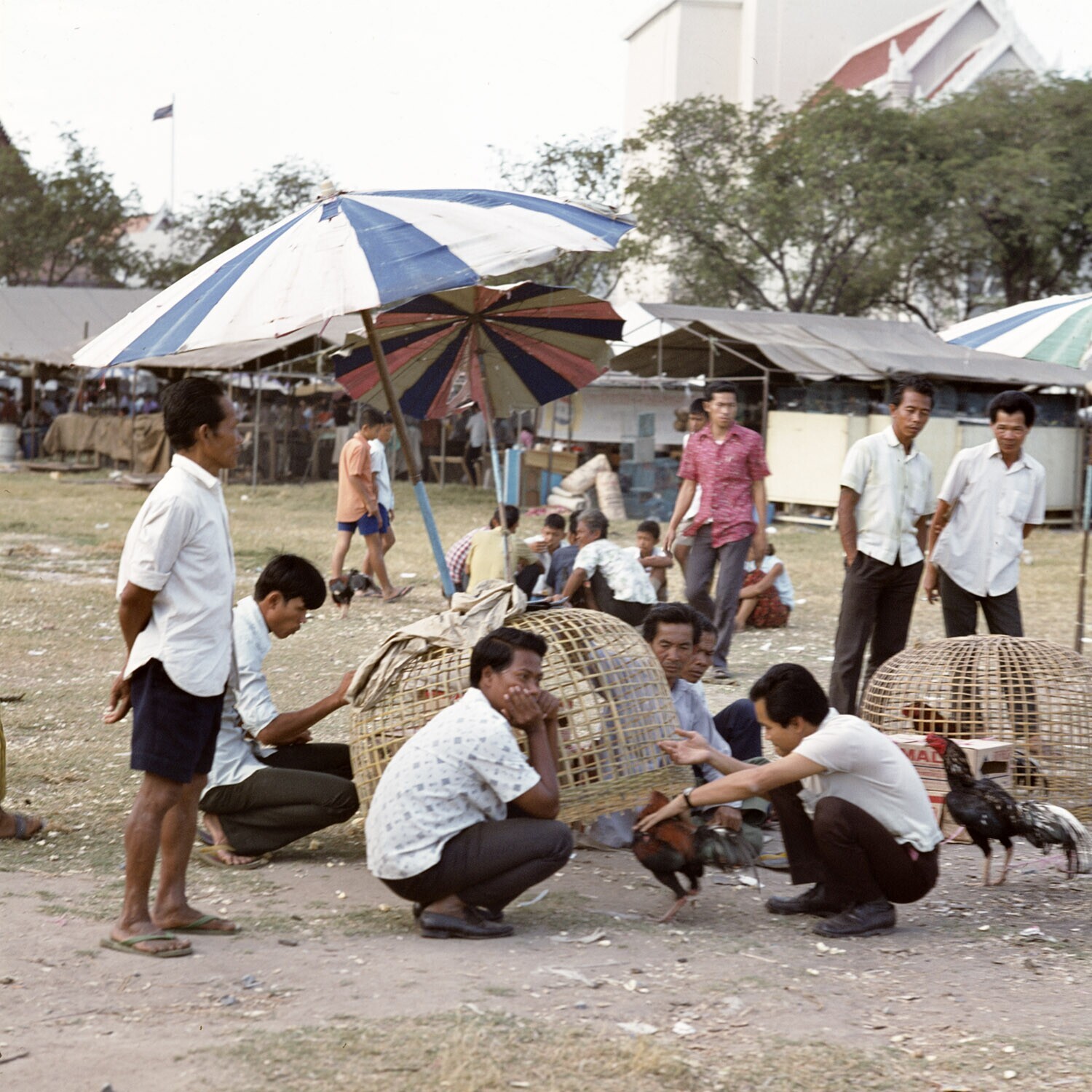 Verkoop van kemphanen op de weekend-markt in Bangkok
