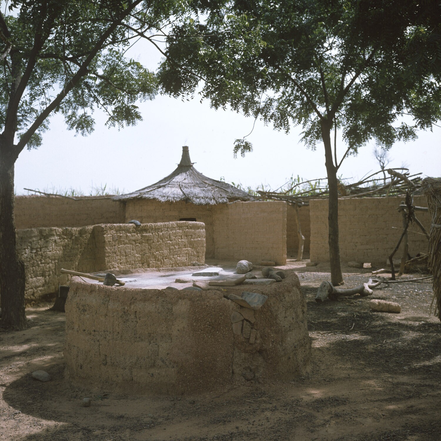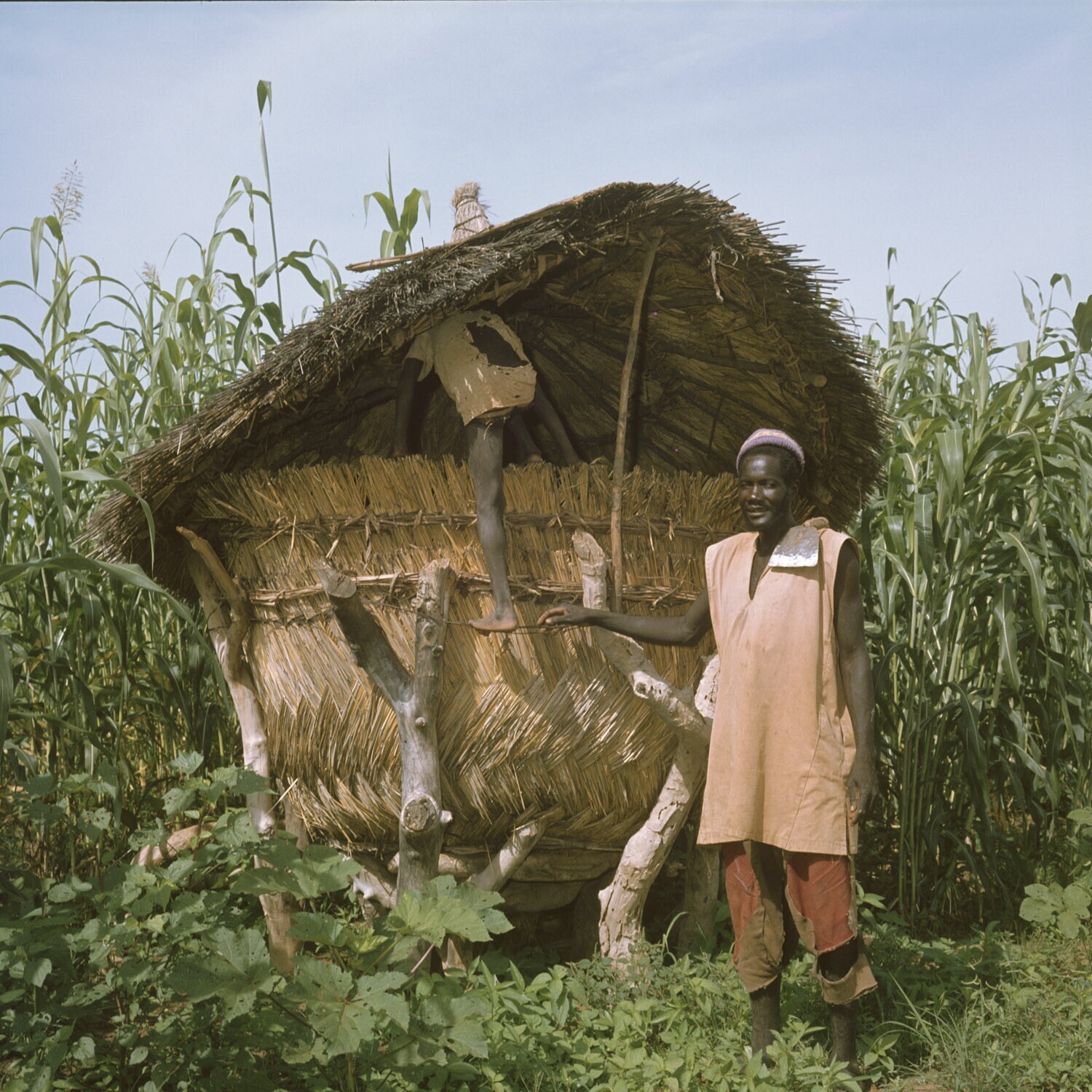 'Mossiboer bij zijn graanschuur; met een stok wordt ...