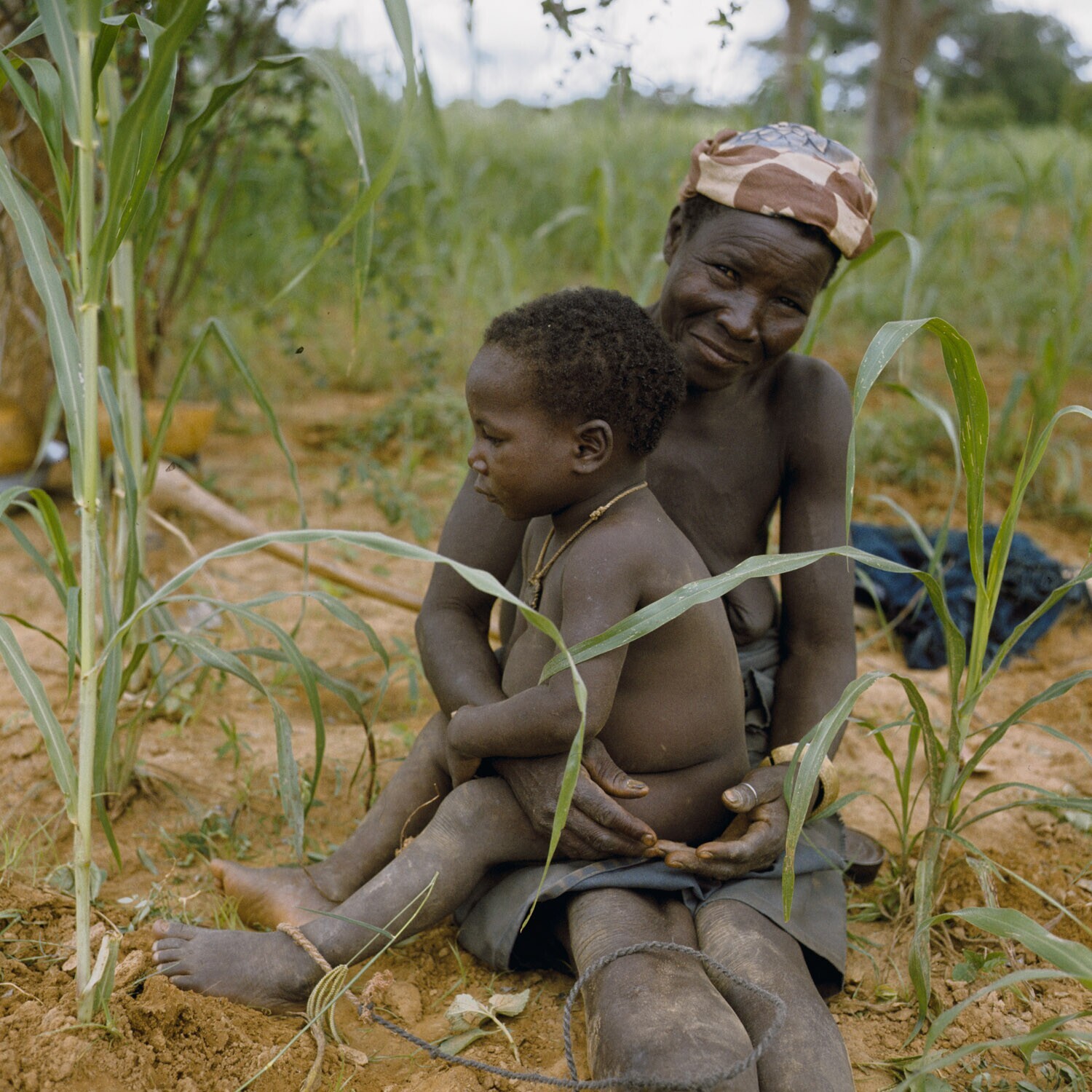 Mossivrouw met kind rustend van haar wiedwerkzaamhed...