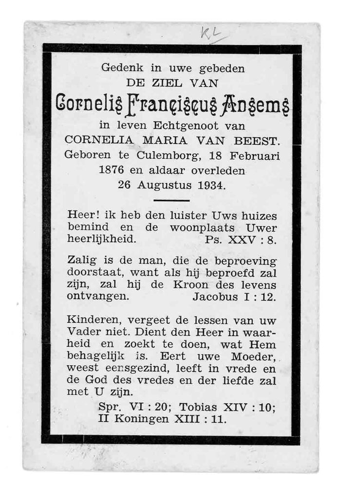 bidprent voor Cornelis Franciscus Ansems. Geboren 18...