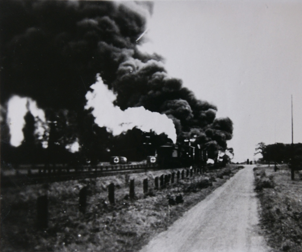 een in brand geschoten Duitse olietrein ergens tusse...