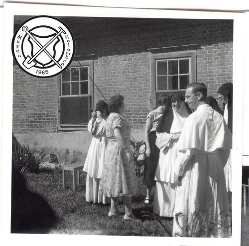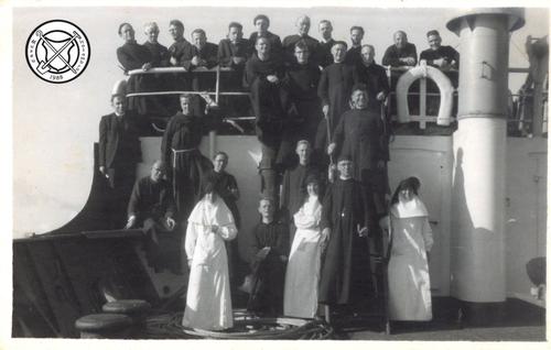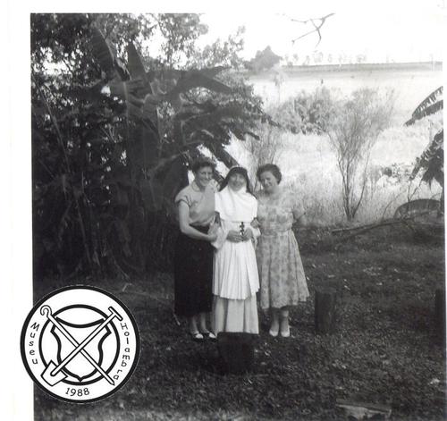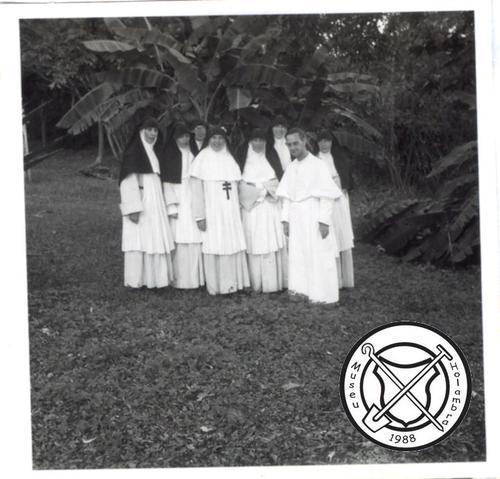 Zusters en pater Sijen op de patio van het fazendahuis