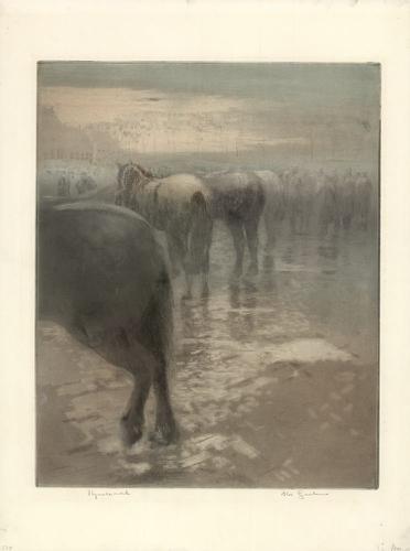 Ets in kleur van de paardenmarkt in Franeker door Ab...
