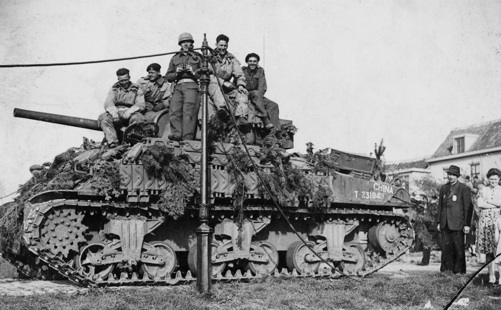 Prentbriefkaart voorstellende een Sherman-tank met b...