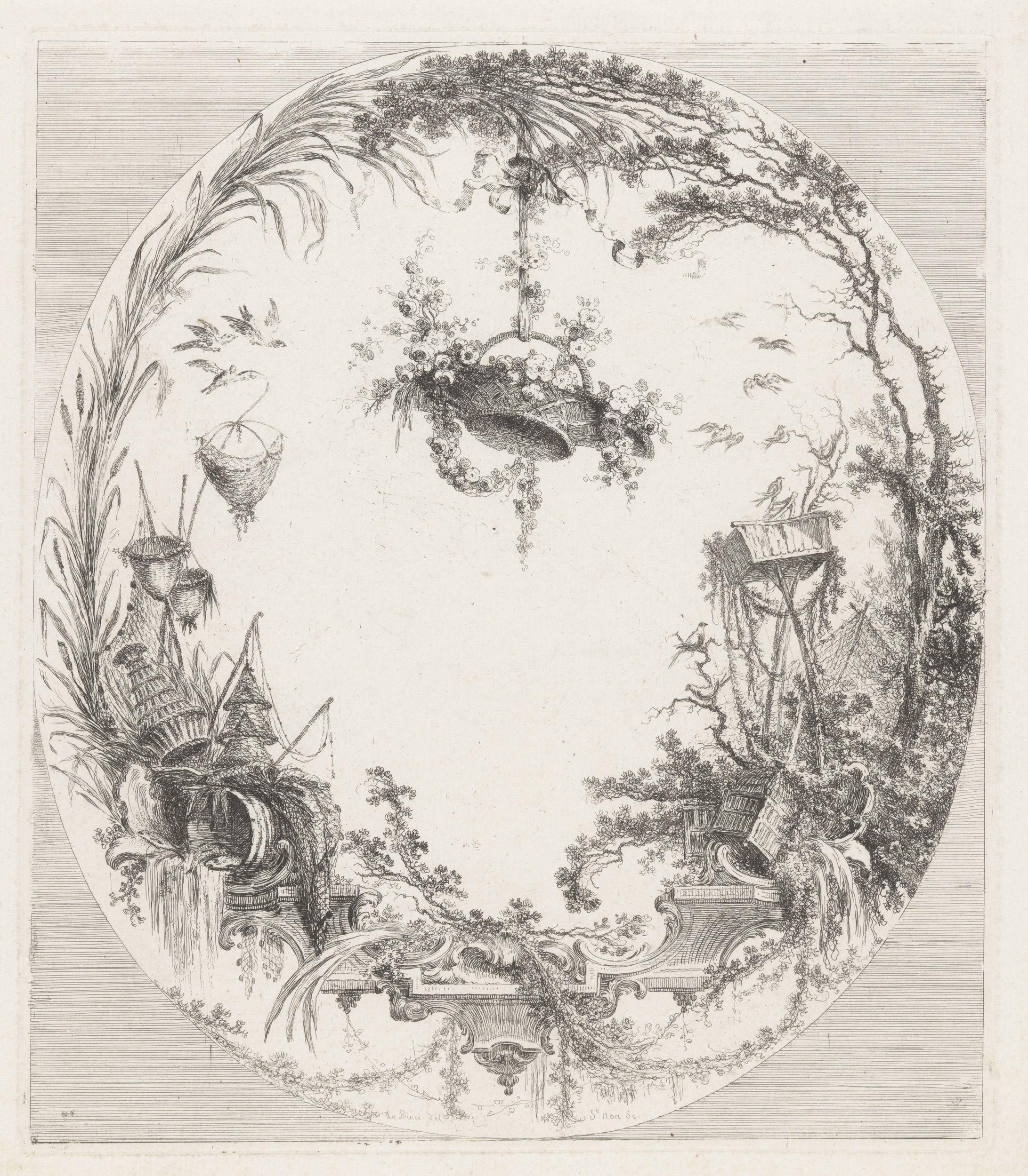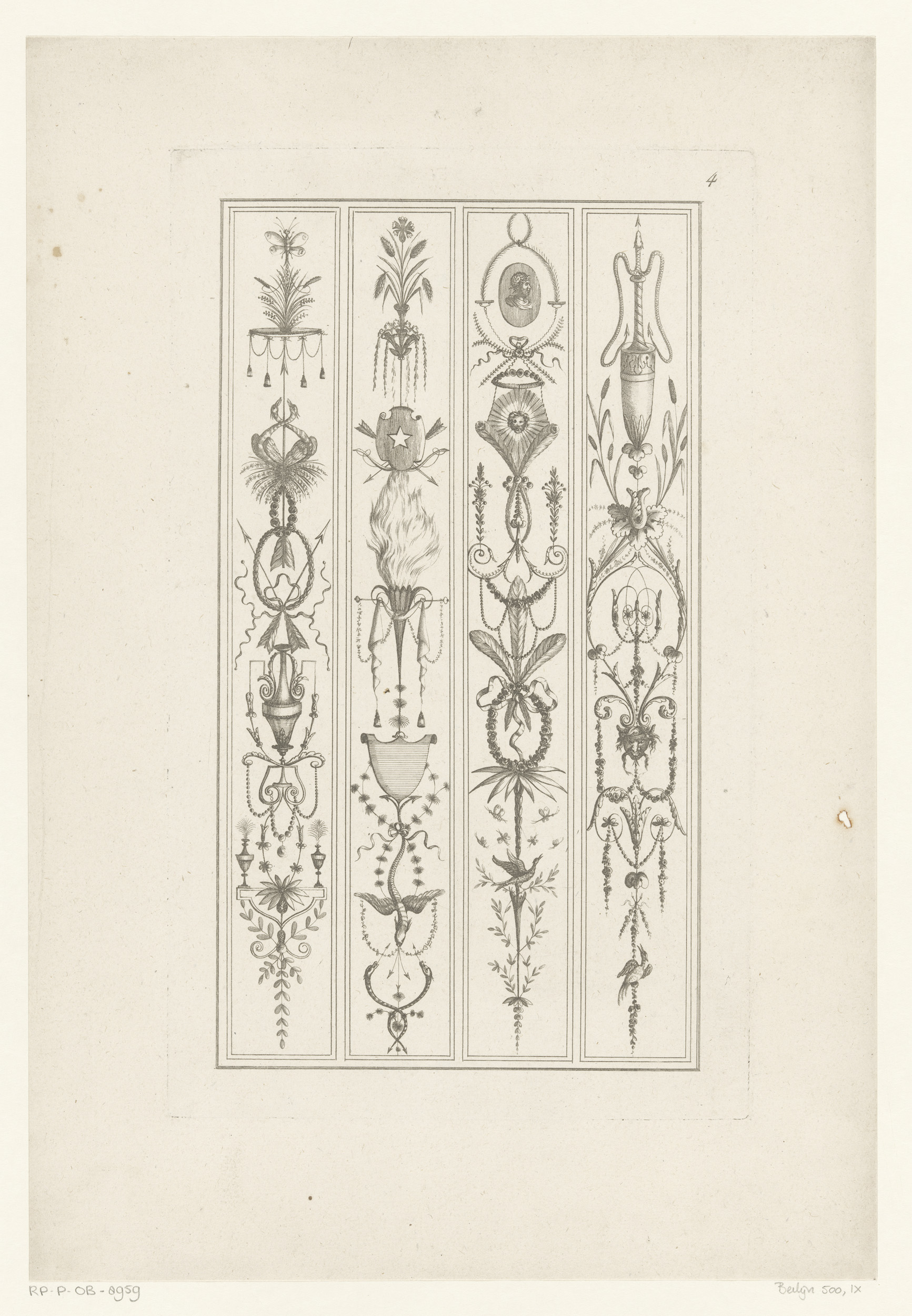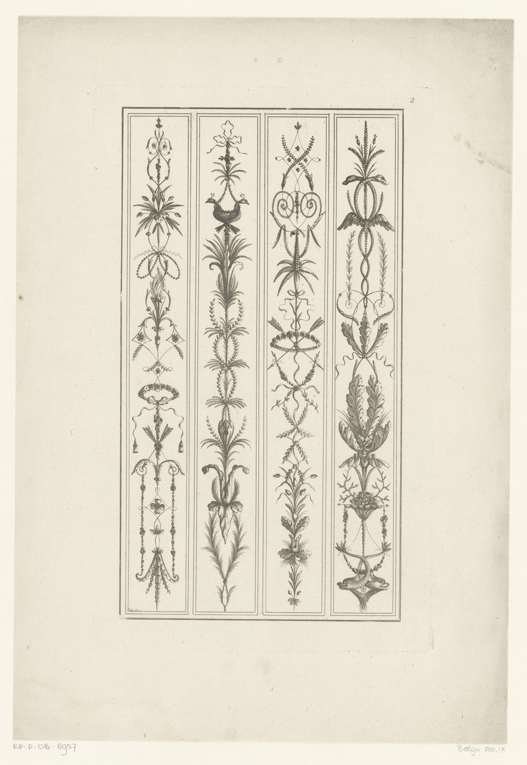 Arabesken met rookvaten, vogels, figuren met globes ...