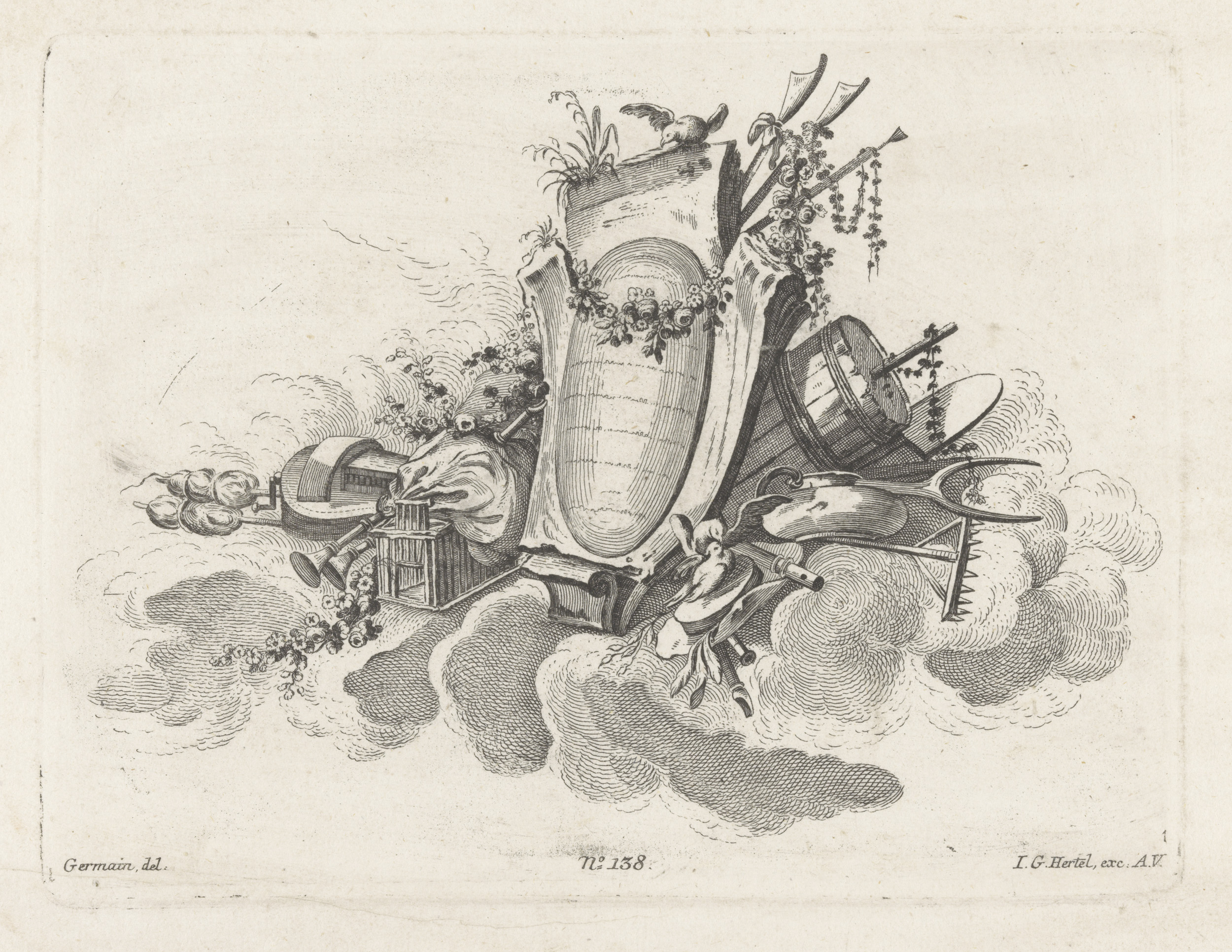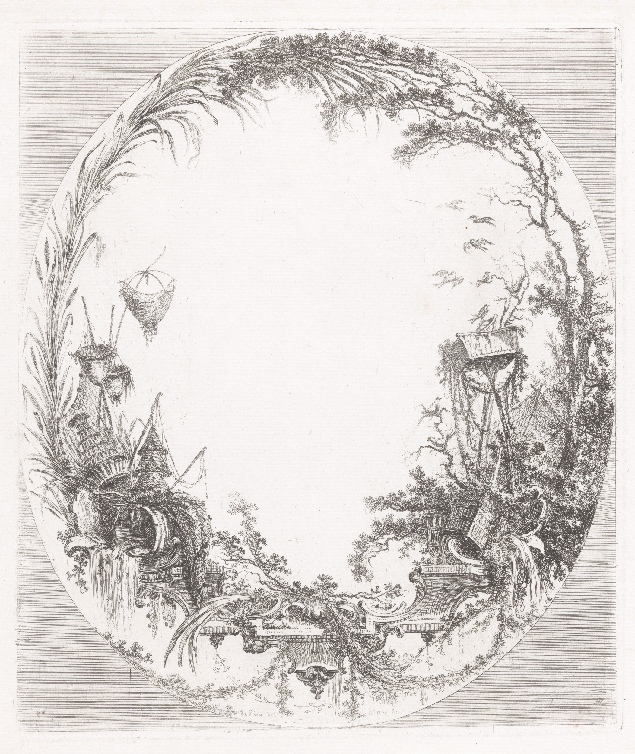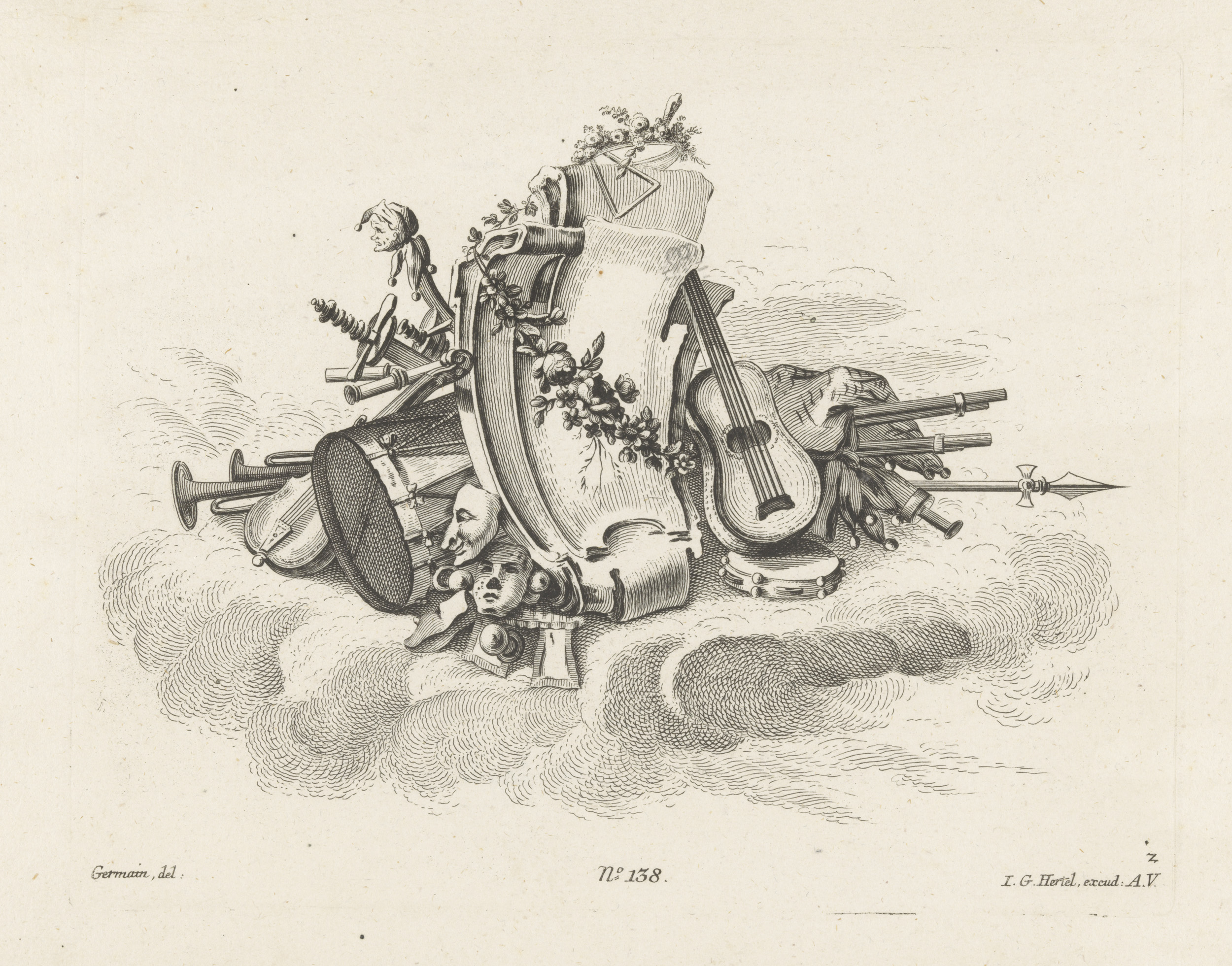 Arabesken met rookvaten, vogels, figuren met globes ...