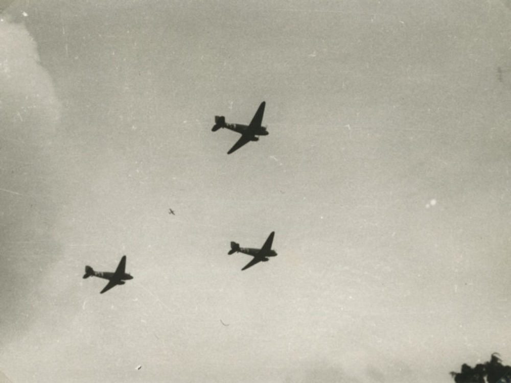 Foto van drie C-47's van de grond af gezien. Tekst a...
