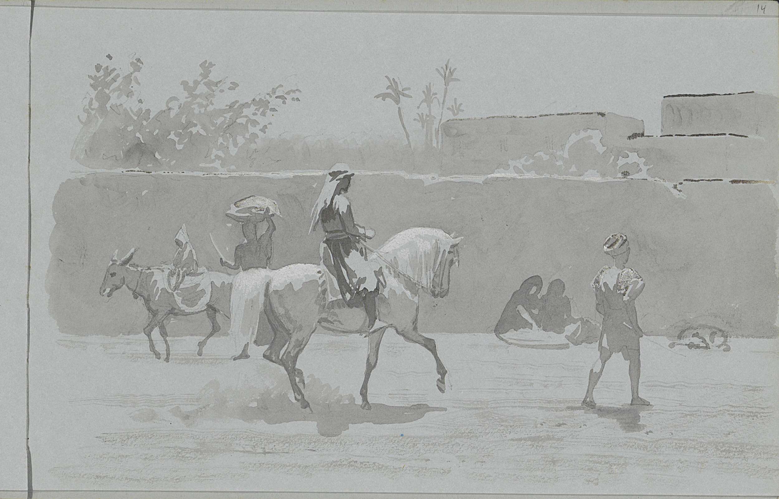 Ruiters, lopende en zittende figuren bij een muur