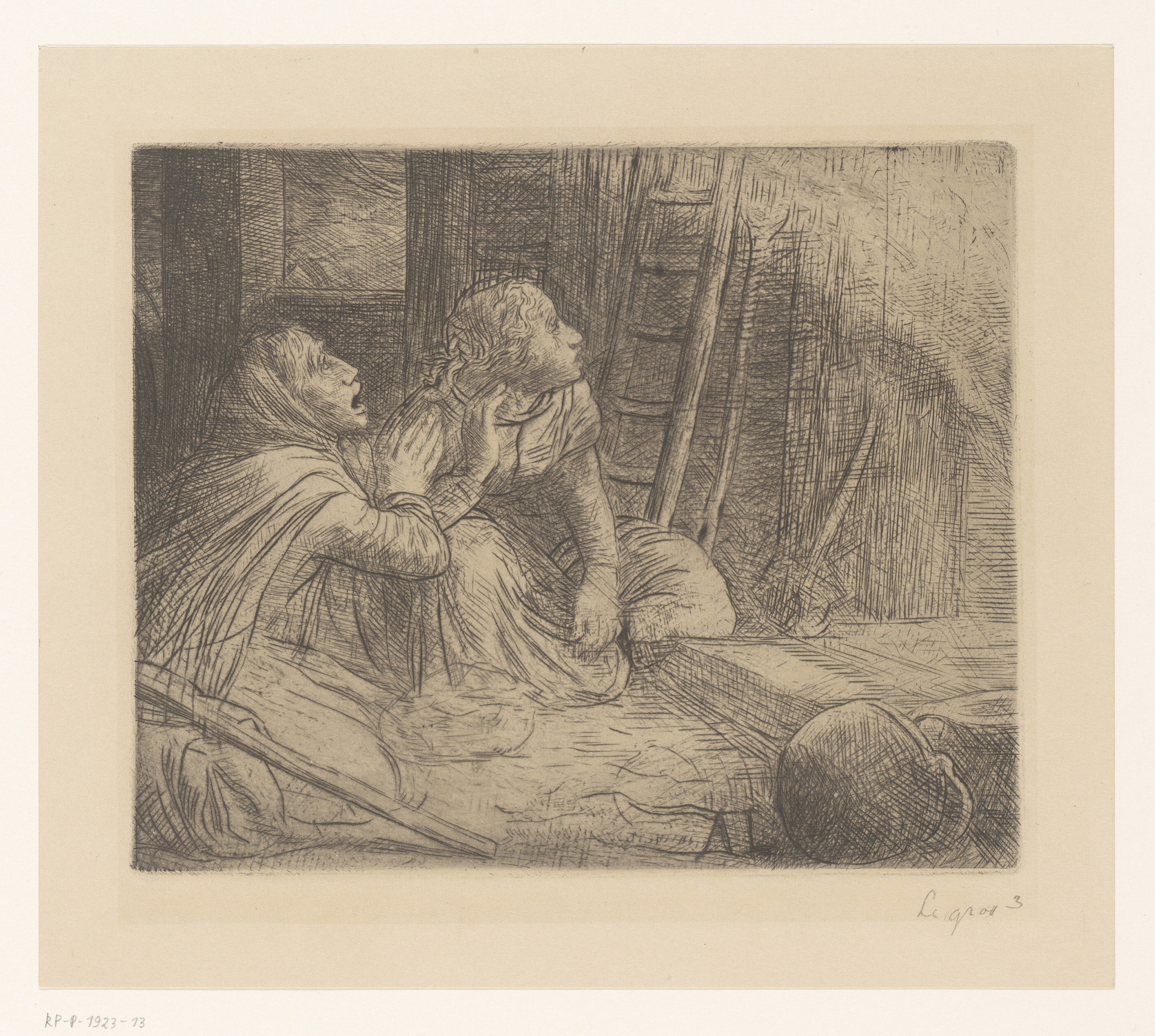 Interieur met twee liggende mannen, een vrouw staat ...