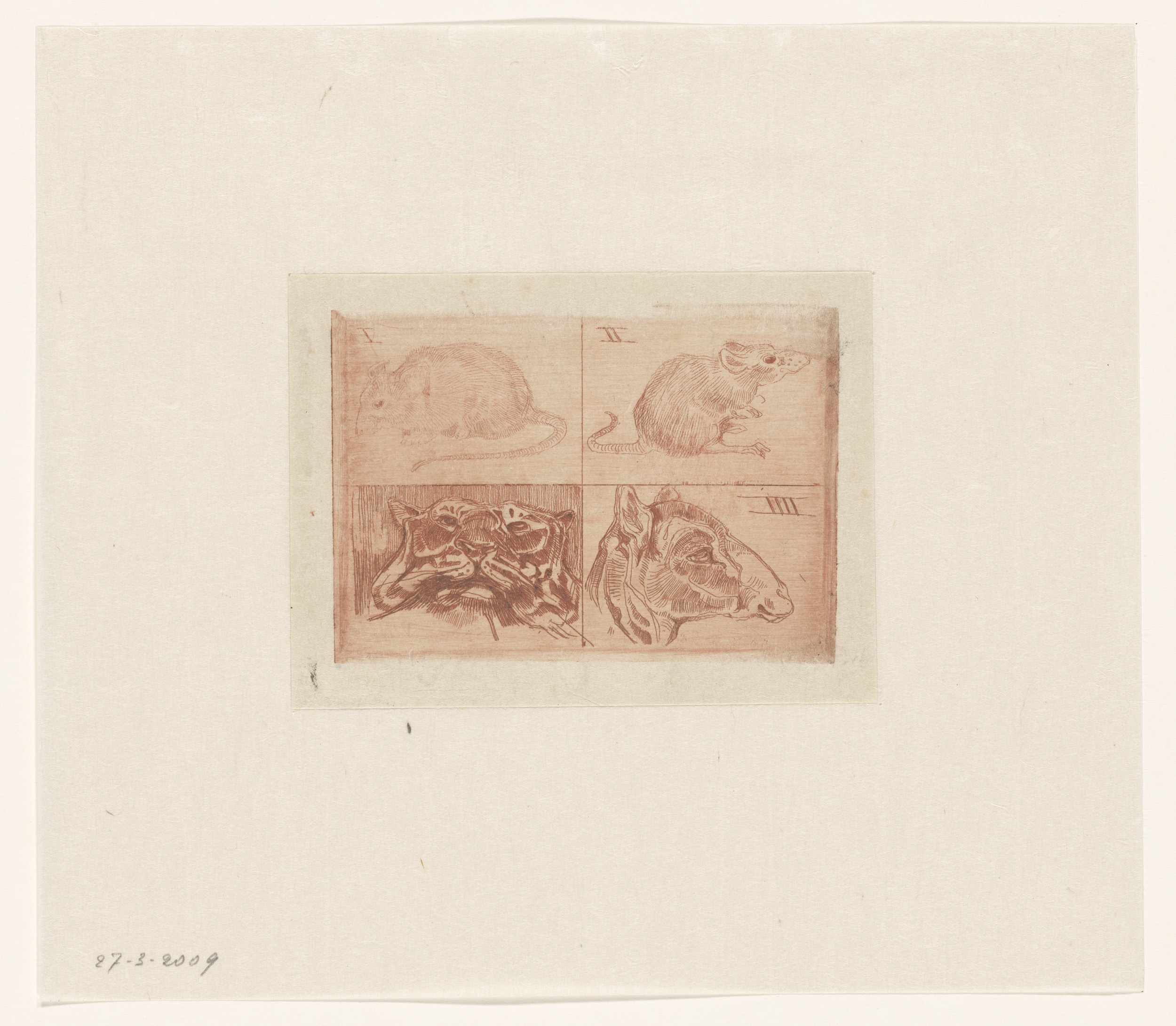 Studies van twee muizen, een tijgerkop en een kop va...