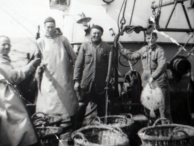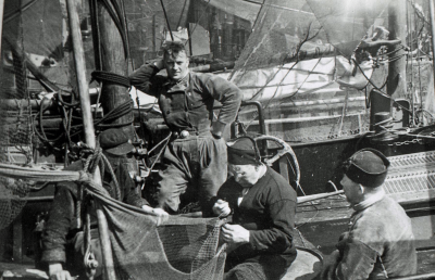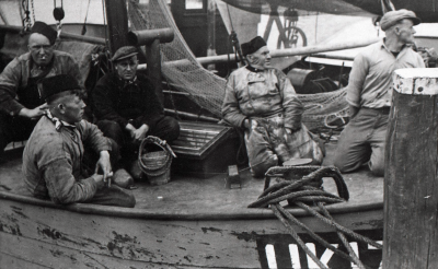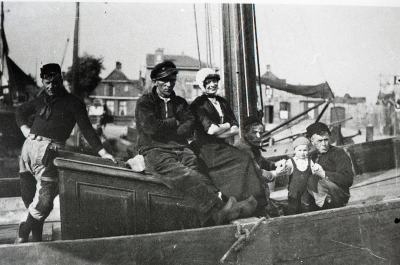 Urker vissers op een schip, met daarbij een vrouw en...