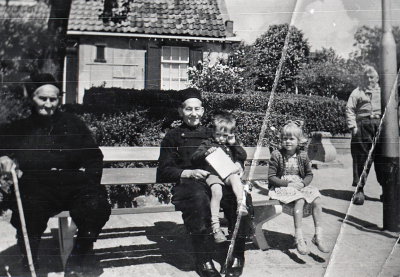 Oudere Urkers in klederdracht zitten op een bankje, ...