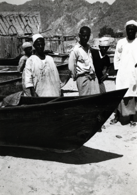 Drie mannen bij een boot, bakboordzijde, een anker o...