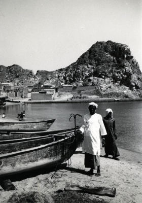 Twee mannen bij boten, een houdt een anker op, heuve...