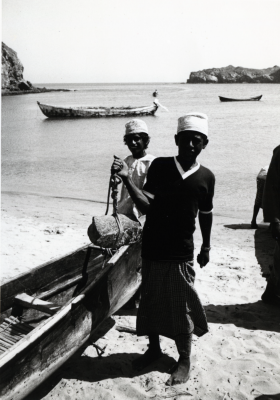 Twee jongens bij een boot, een houdt een anker op.