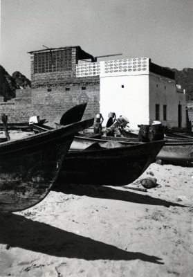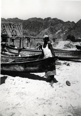 Boten op het droge, twee personen dragen iets op hun...