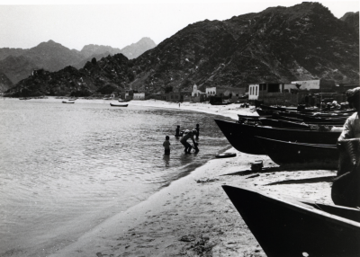 Boten op het droge, personen in het water, heuvels e...