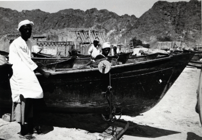 Enkele mannen achter een boot, heuvels op de achterg...