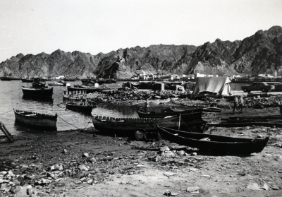 Boten op het droge, schepen in het water in een baai...