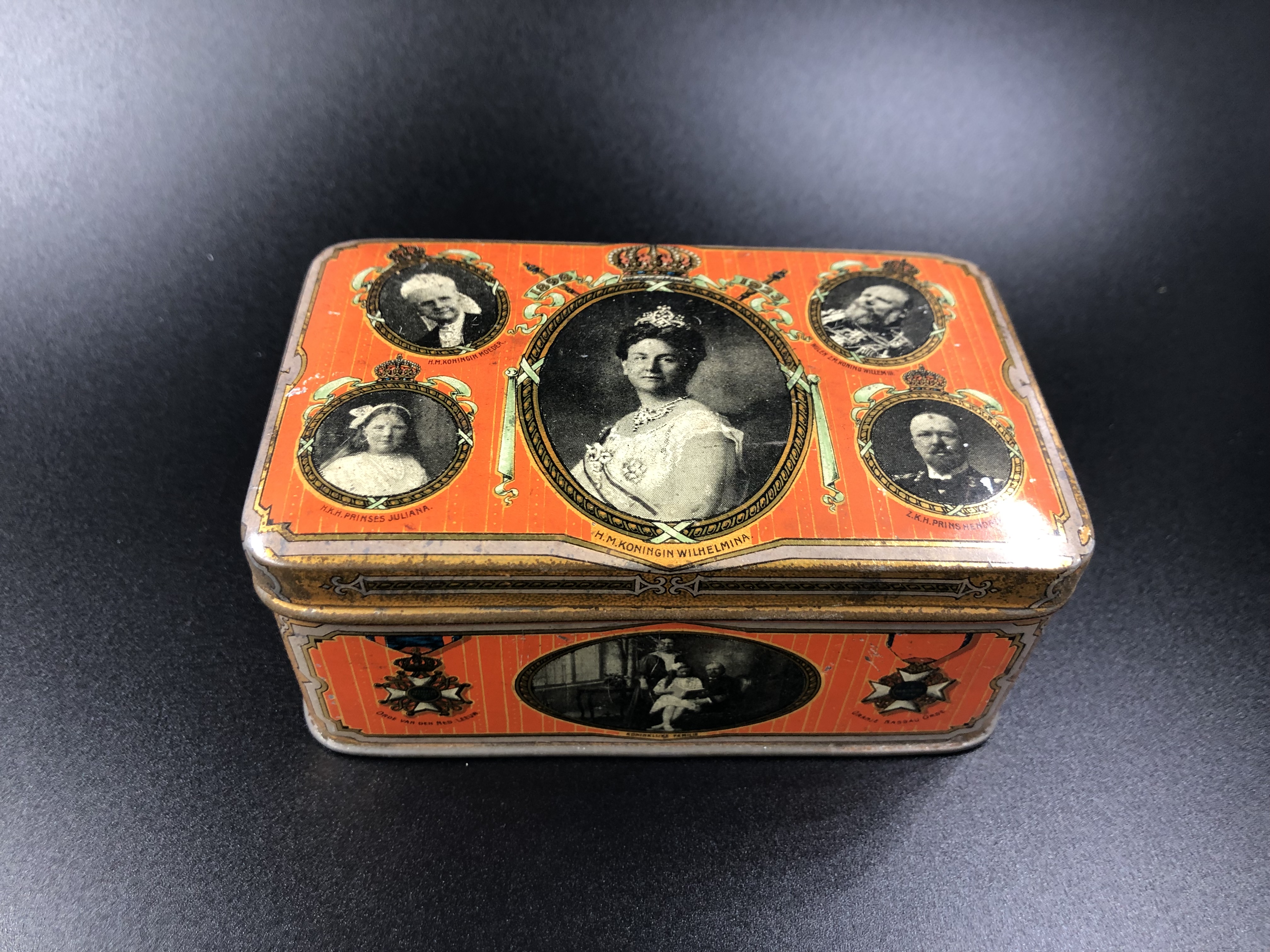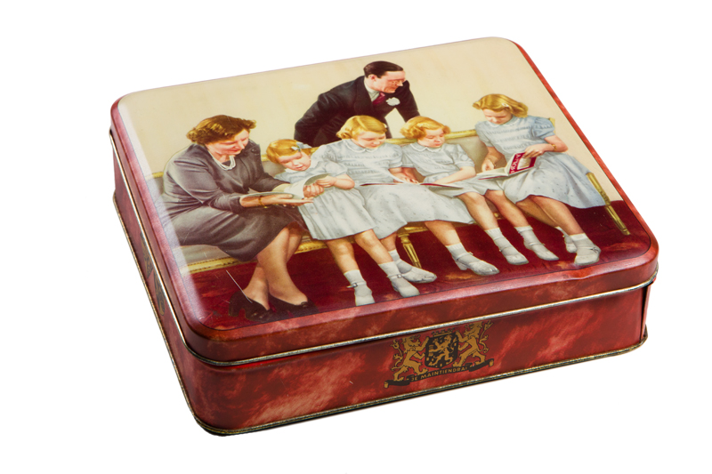 Koektrommel met een familieportret van koningin Juli...