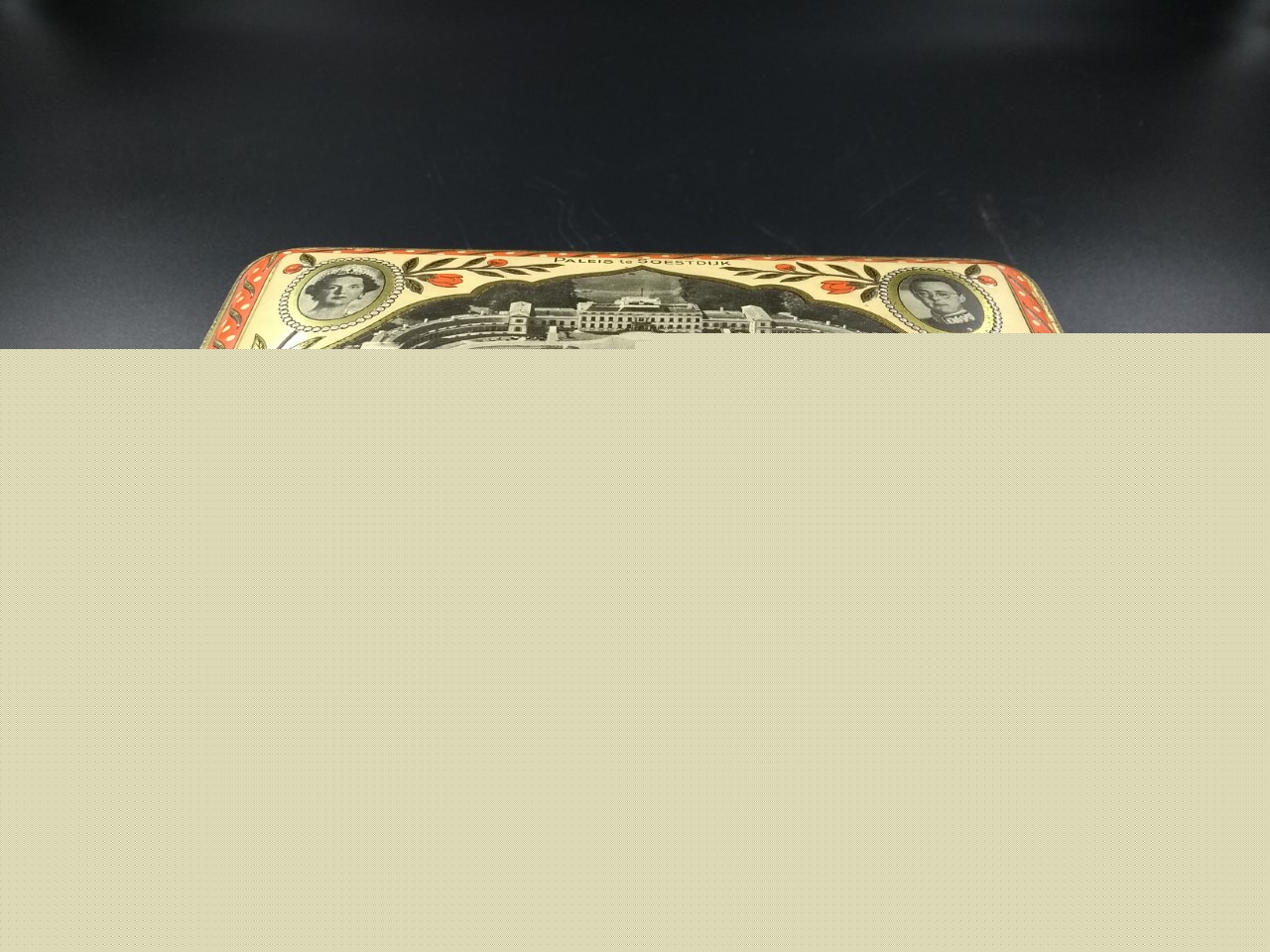 Koektrommel met luchtfoto's van paleis Soestdijk, pa...