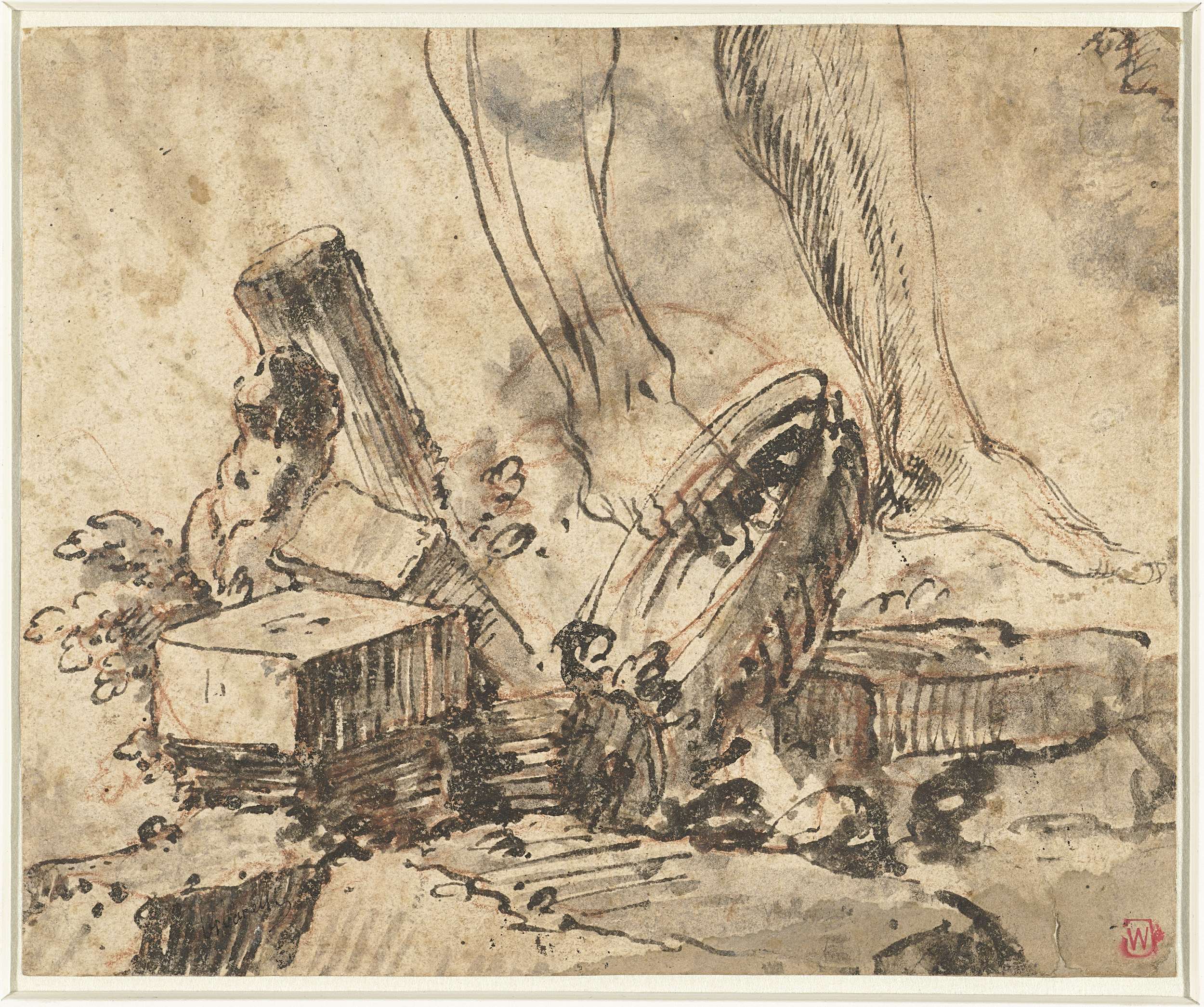 Marmerblokken, een antieke torso en een schaal