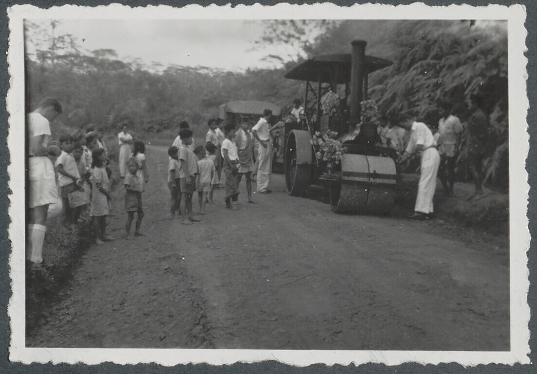 De stoomwals rijdt door de straten van het dorp