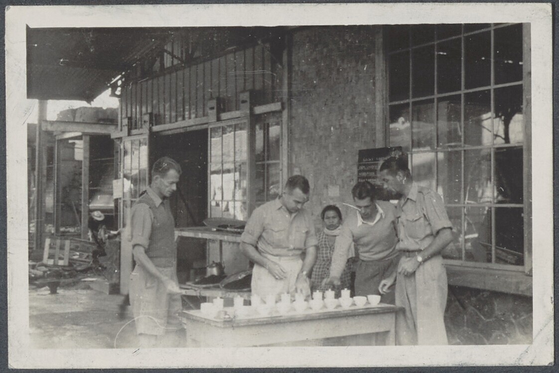 Vier mannen tijdens theeproeven voor en fabriekshal