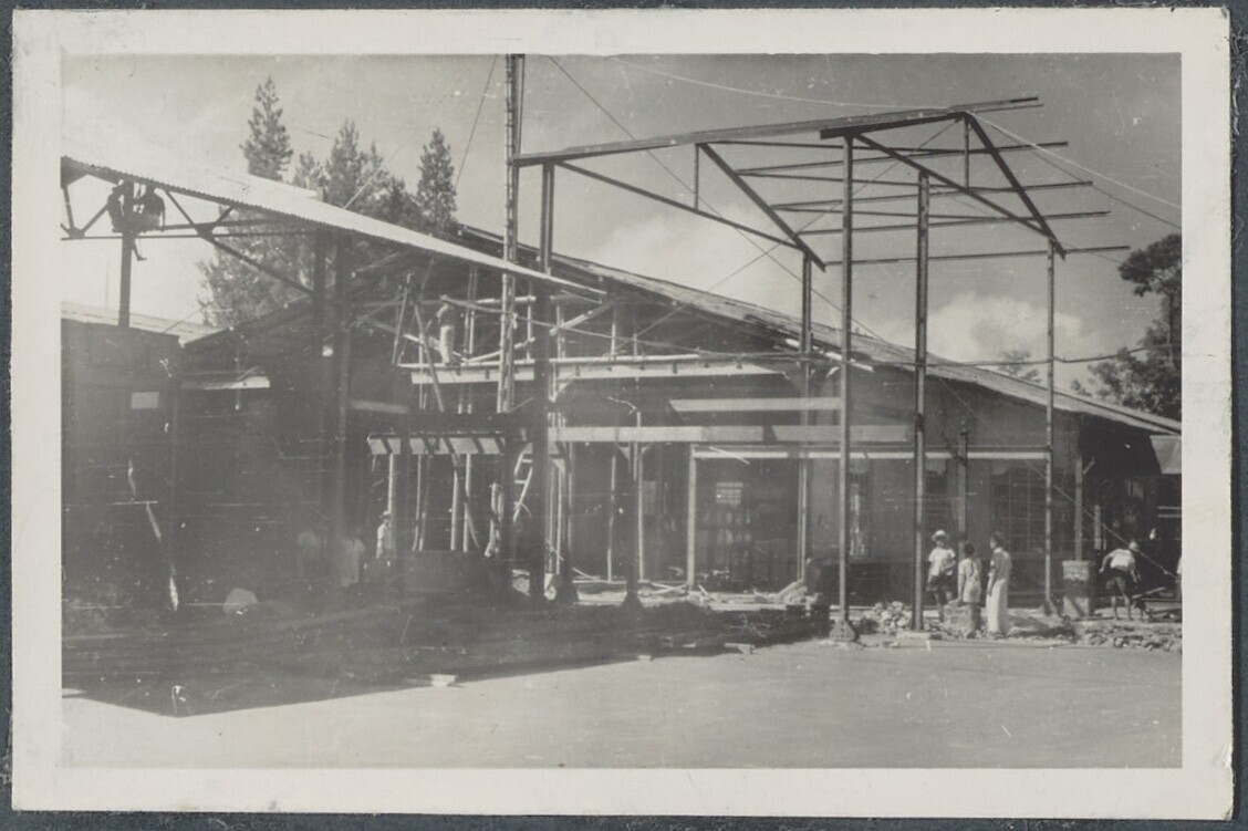 Opzichters en arbeiders in een fabriekshal in aanbouw