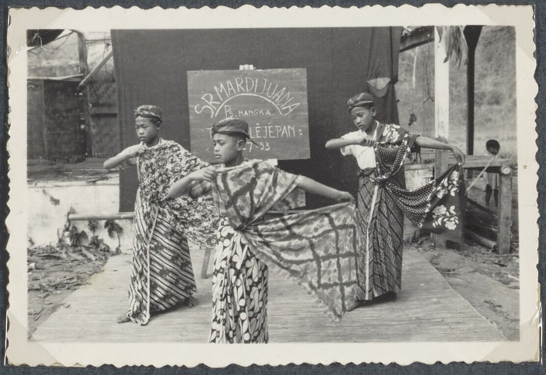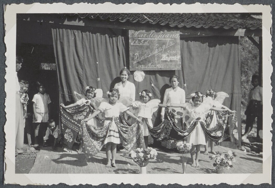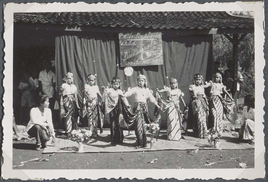 Zeven meisjes voeren een Javaanse dans op tijdens ee...