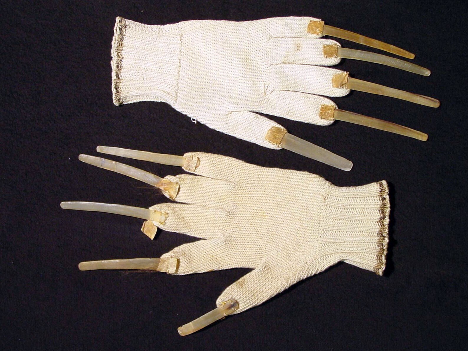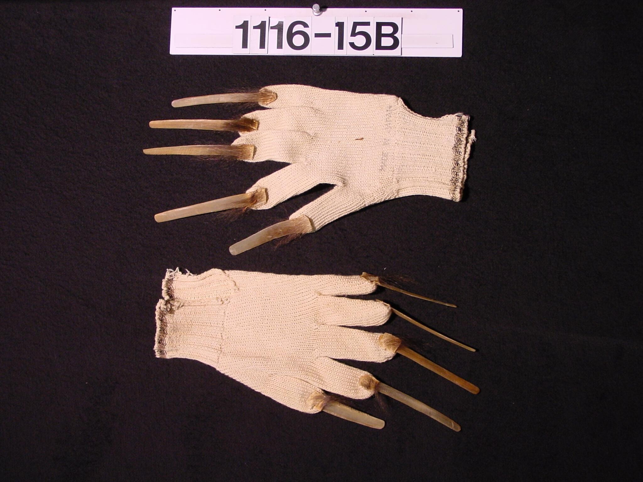 Een paar handschoenen behorend bij een Jauk-kostuum