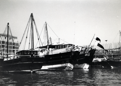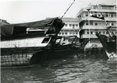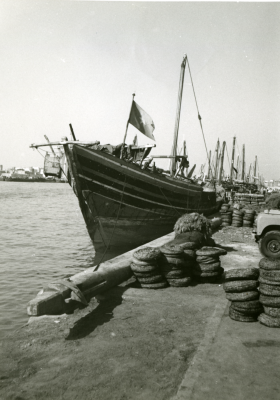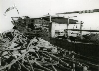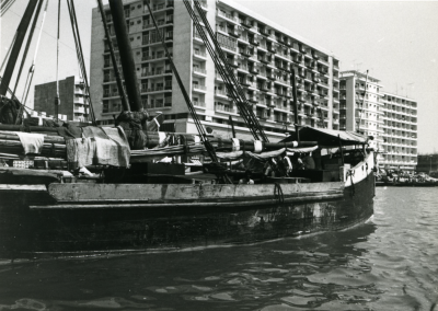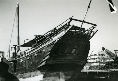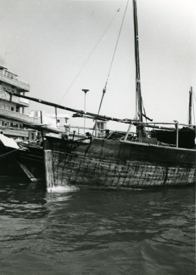 Blik op een schip, bakboordzijde, voor een gebouwenc...