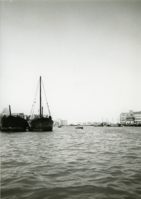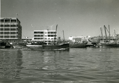 Enkele schepen, veel gebouwen op de achtergrond.