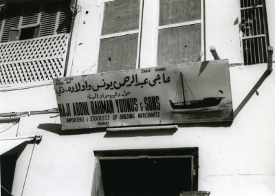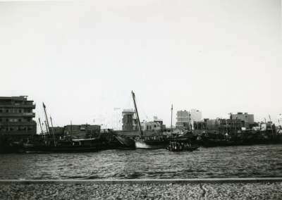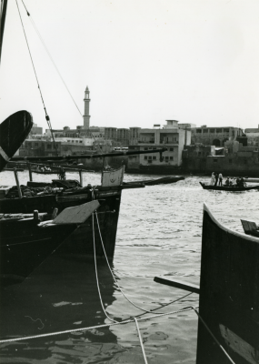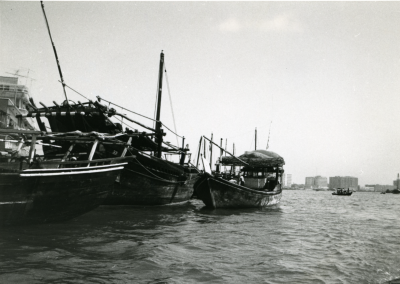 Twee schepen afgemeerd voor de Nat. Bank of Dubai.