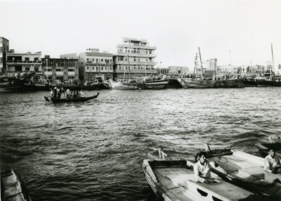 Schepen in de haven, links de National Bank of Dubai.