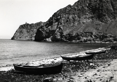Drie boten zonder mast op het droge, heuvelachtige a...