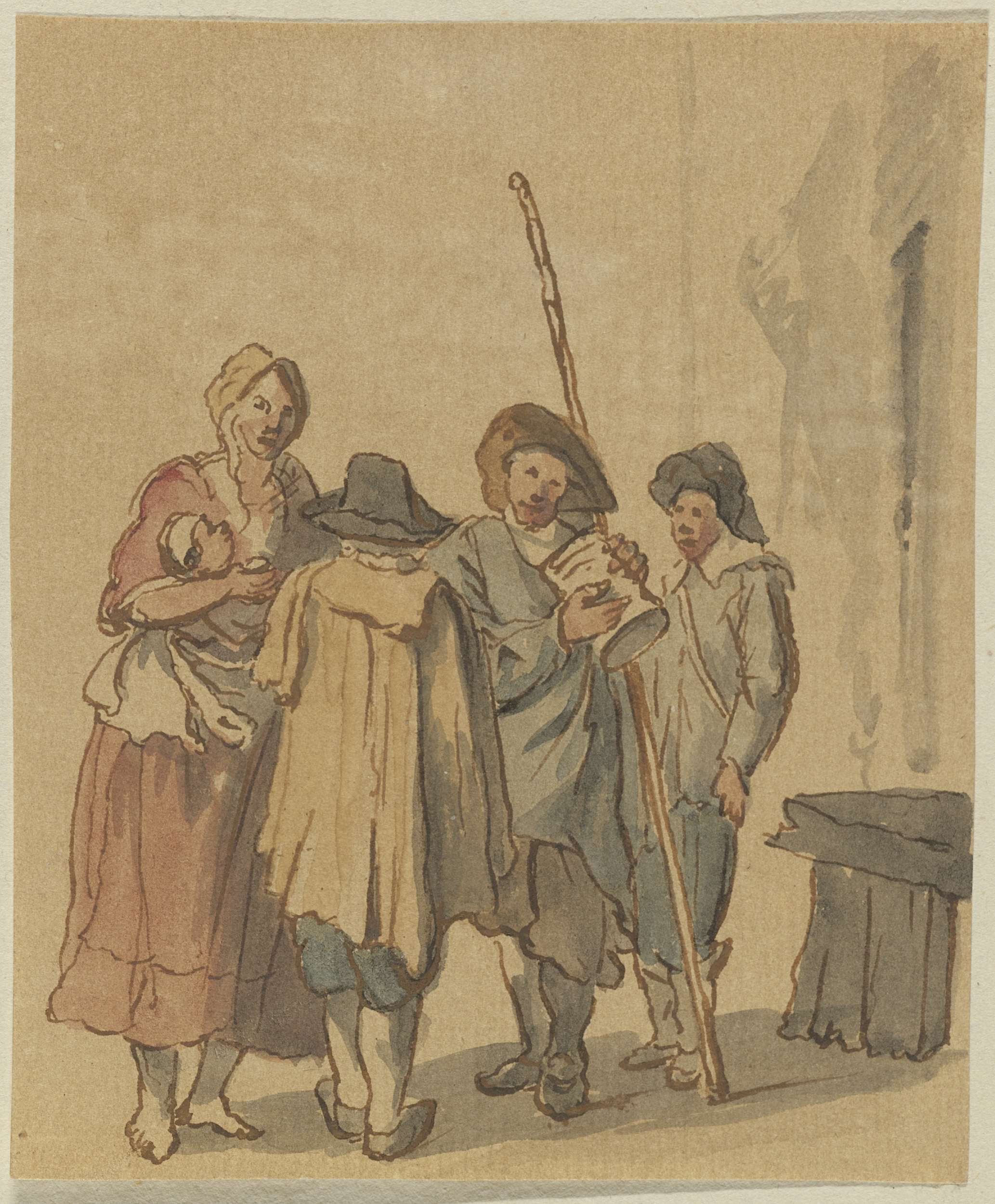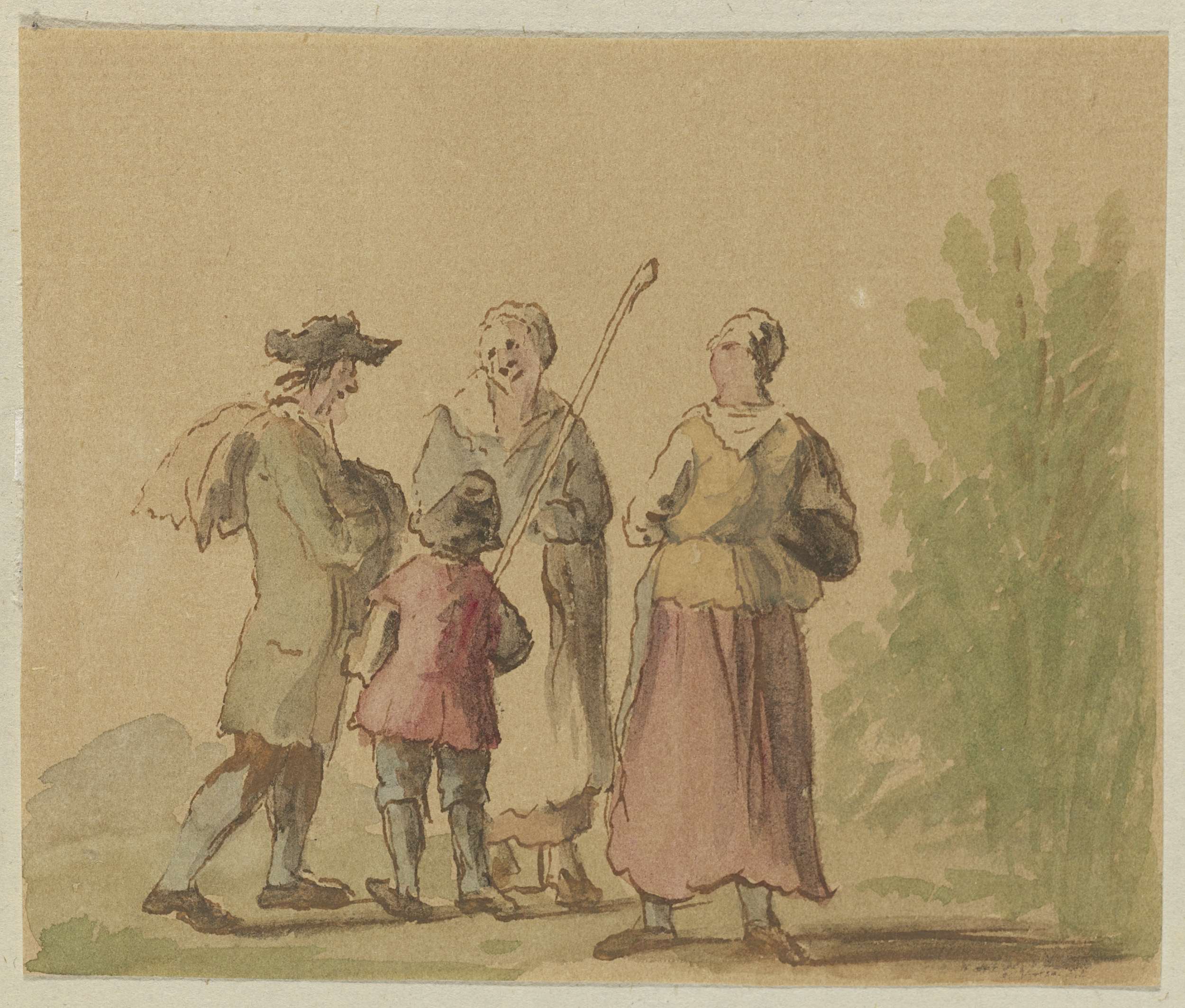 Staand gezelschap, drie mannen en een vrouw met kind...
