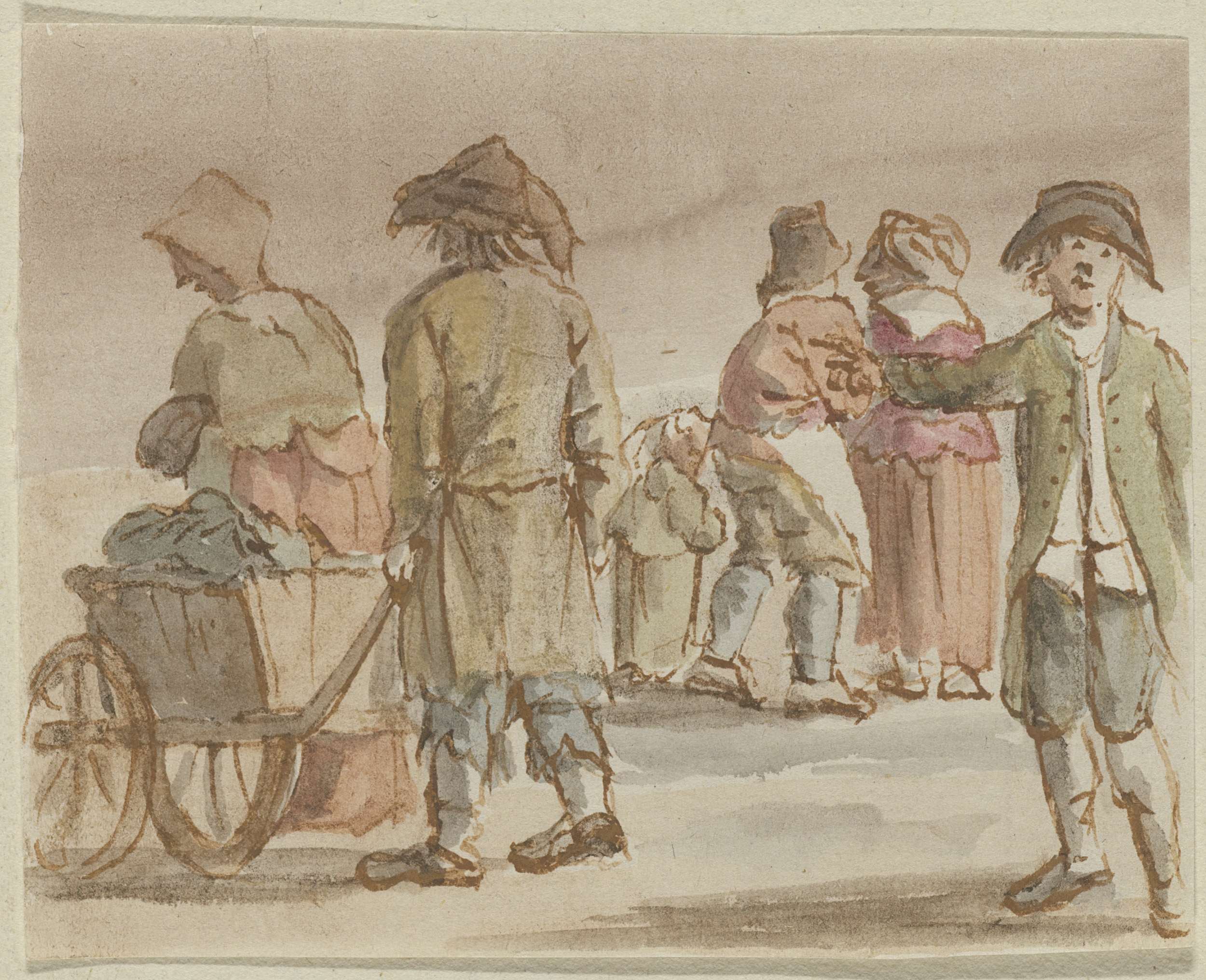 Staande mensen waarvan één met kruiwagen
