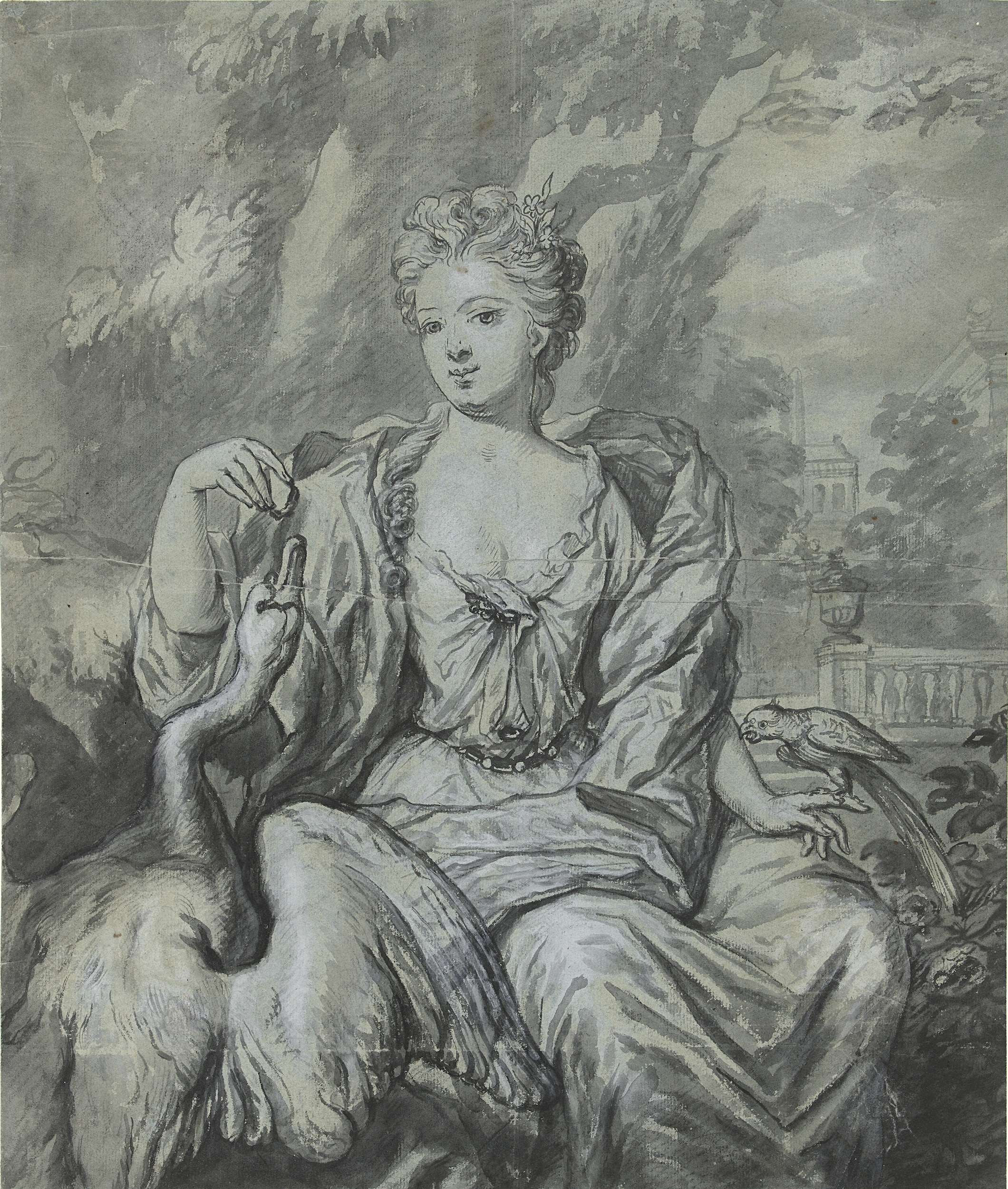 Portret van een vrouw met een zwaan en een papegaai ...