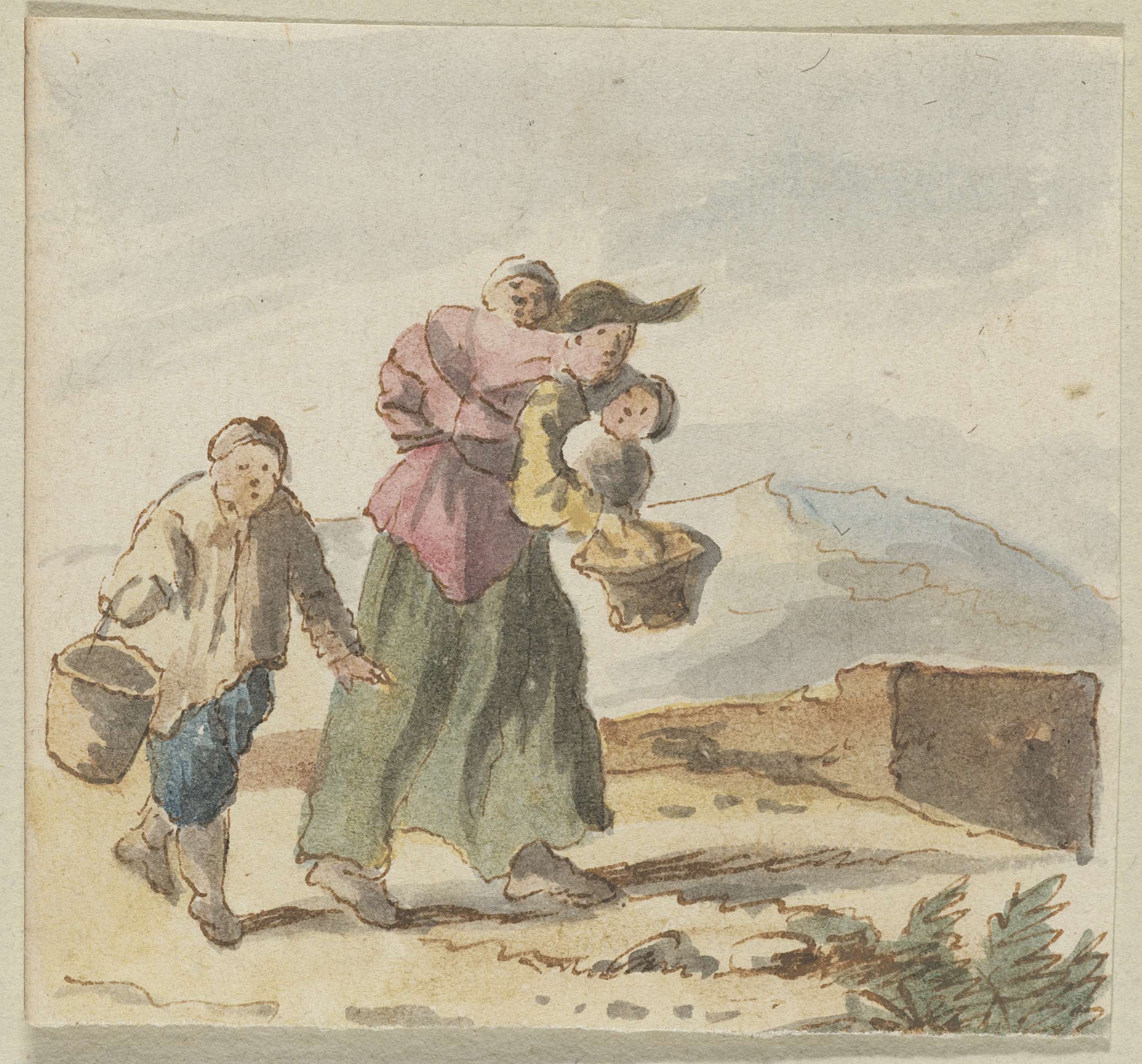 Vrouw met drie kinderen in landschap