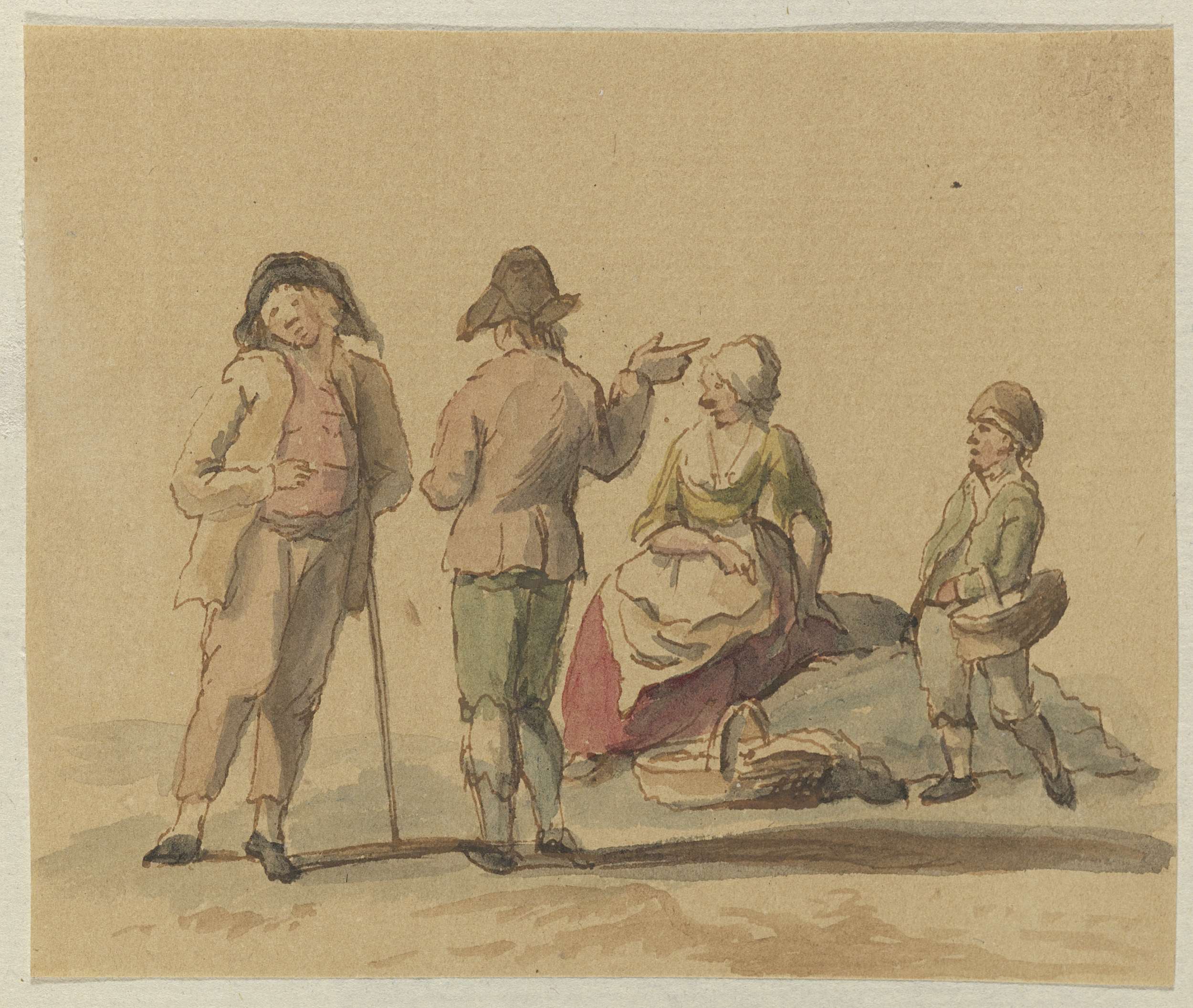 Gezelschap van drie staande mannen en één zittende v...