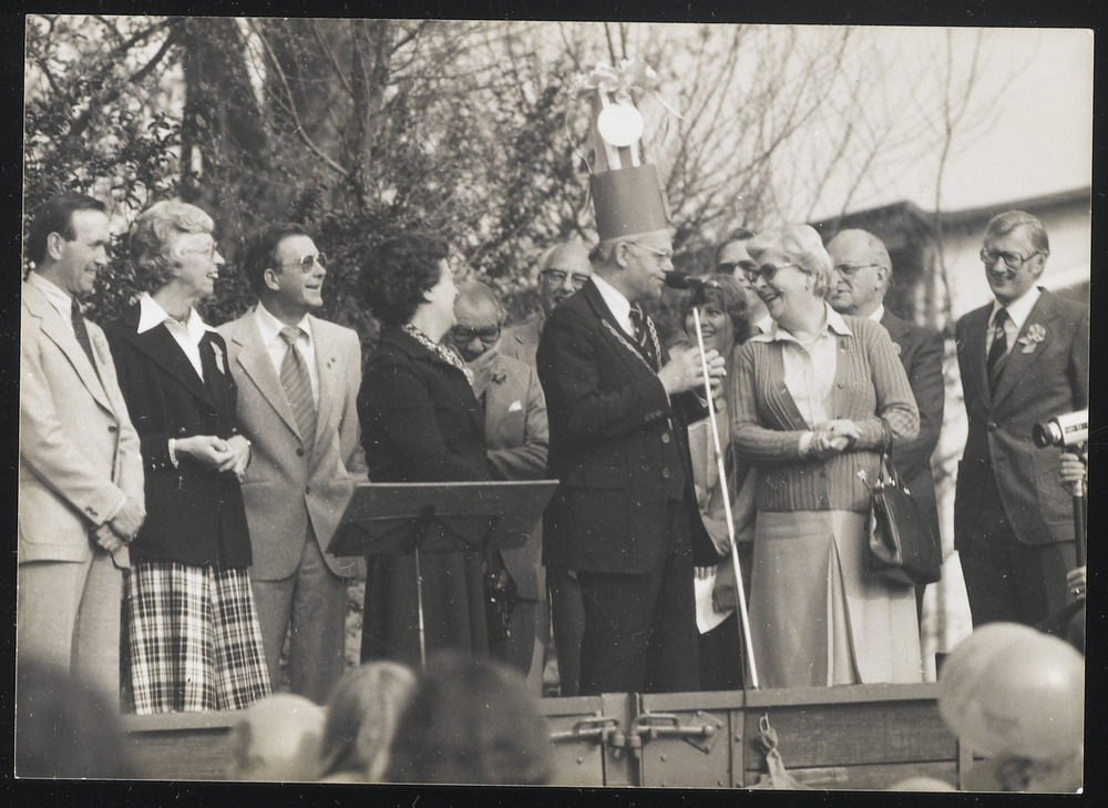 Zwart-wit foto van de eerste steenlegging door J. Sp...