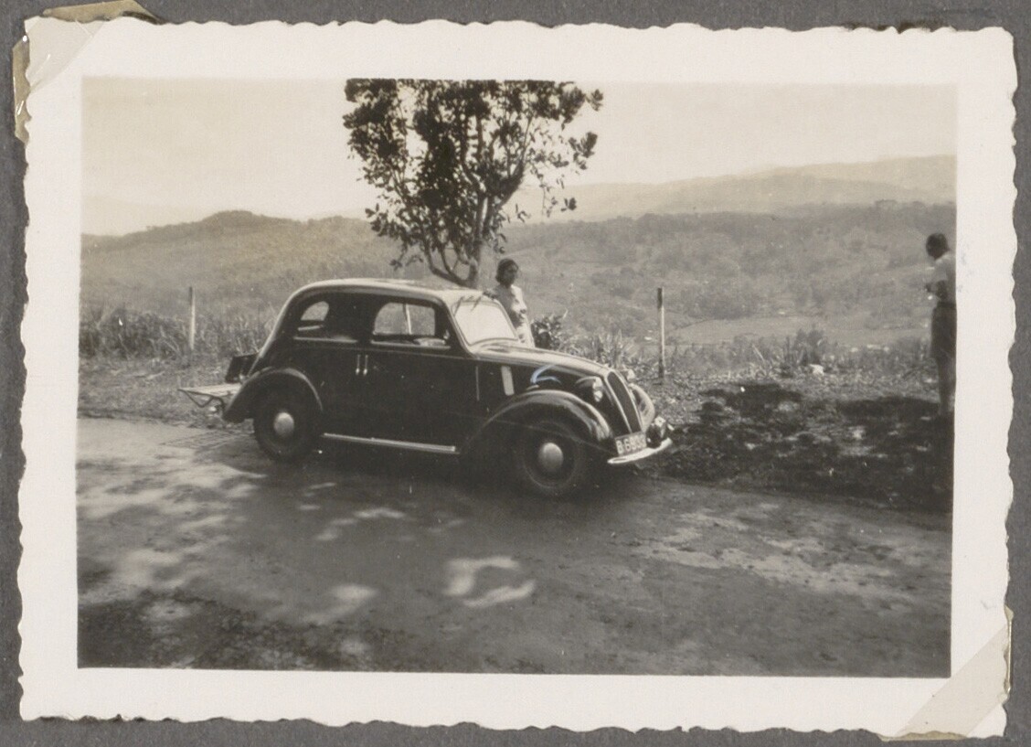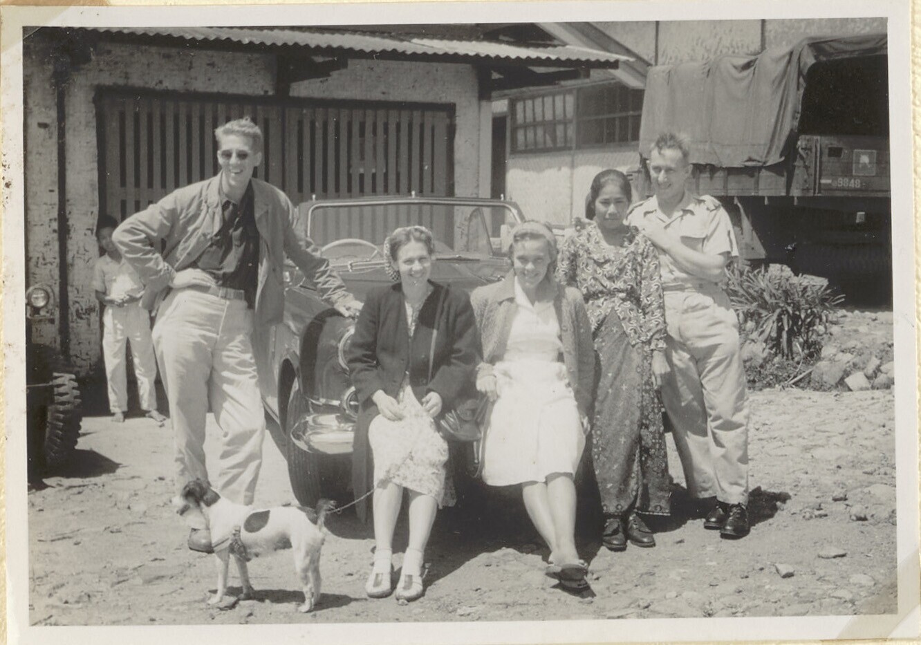 Europese familie, Javaanse vrouw en hond voor de aut...