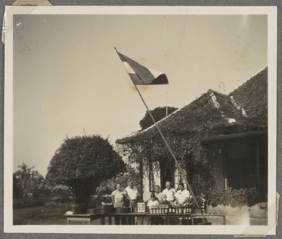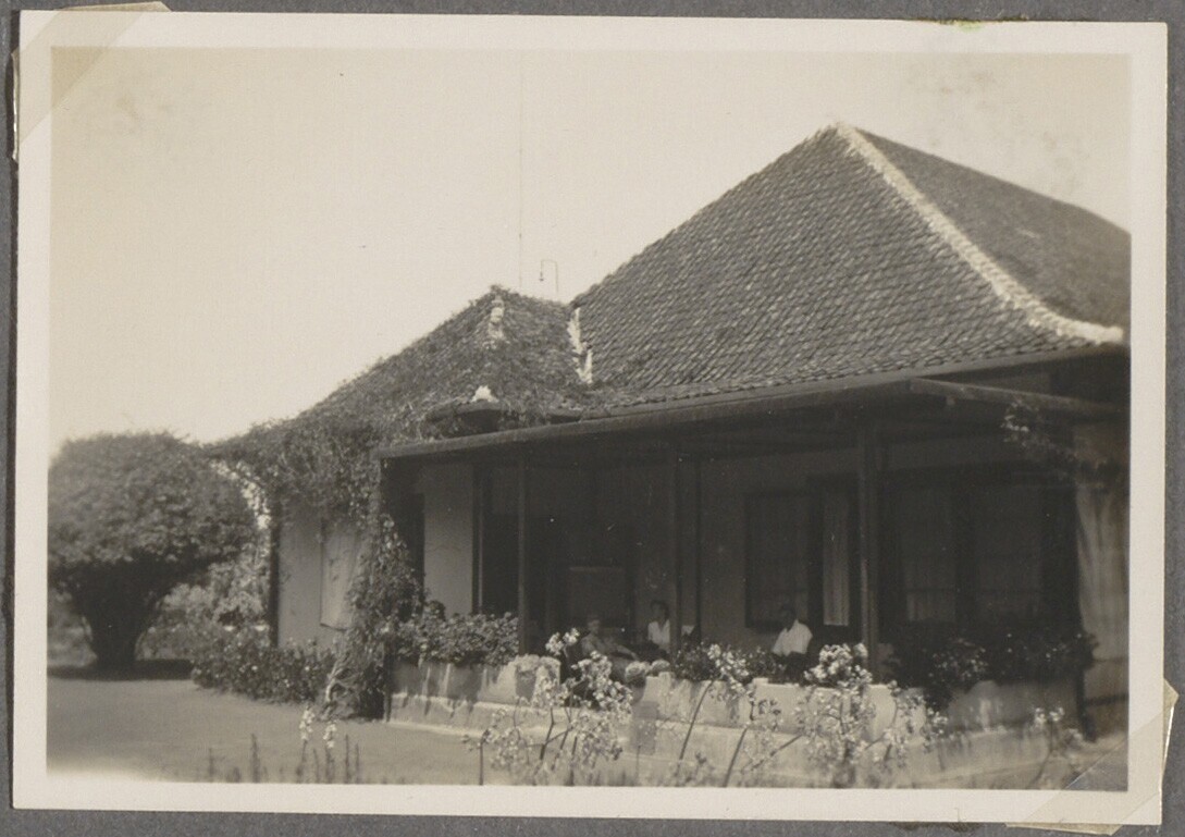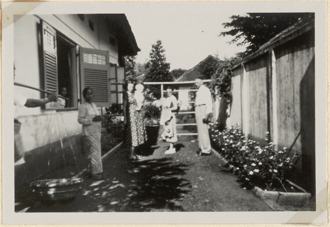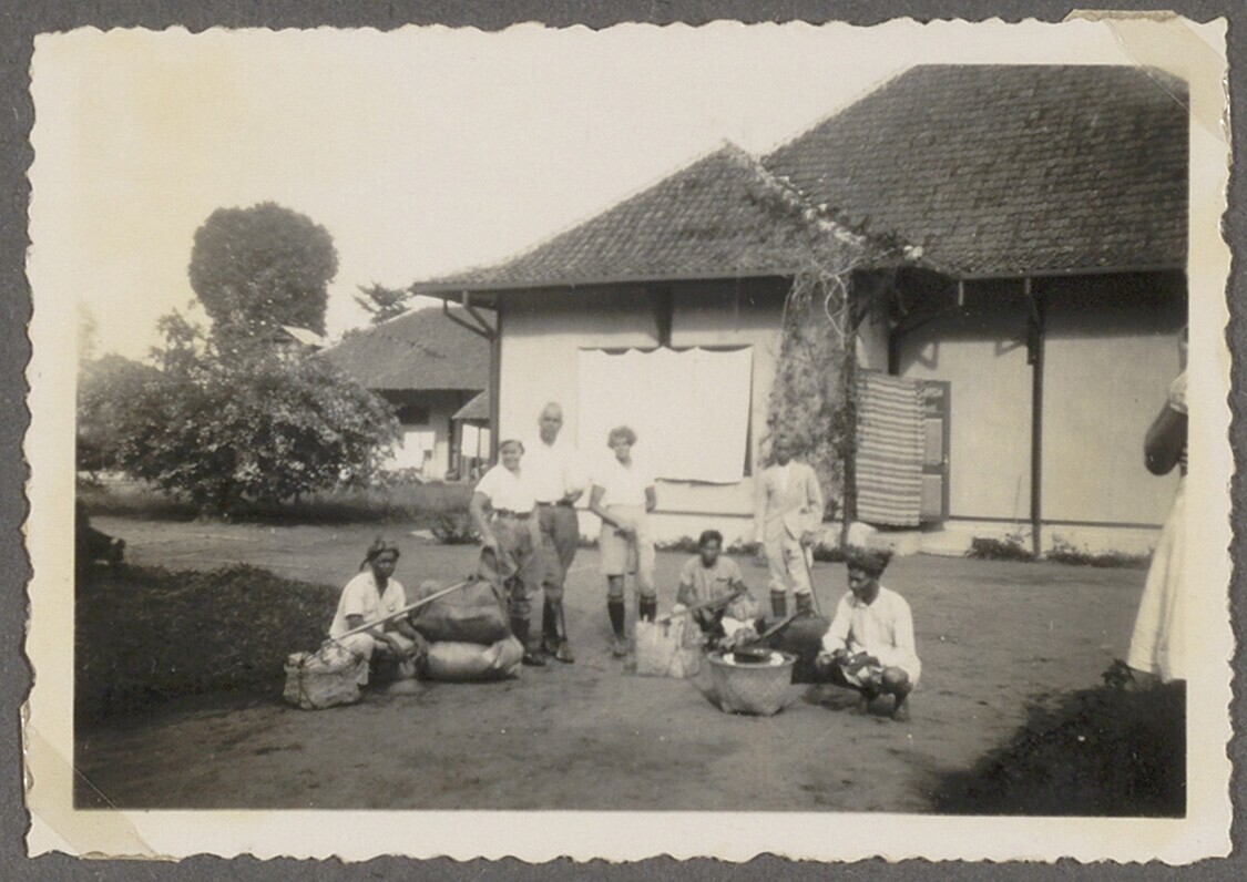 Javaanse kooplieden bieden hun waren aan op het erf ...