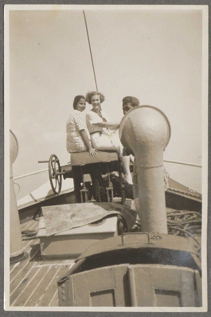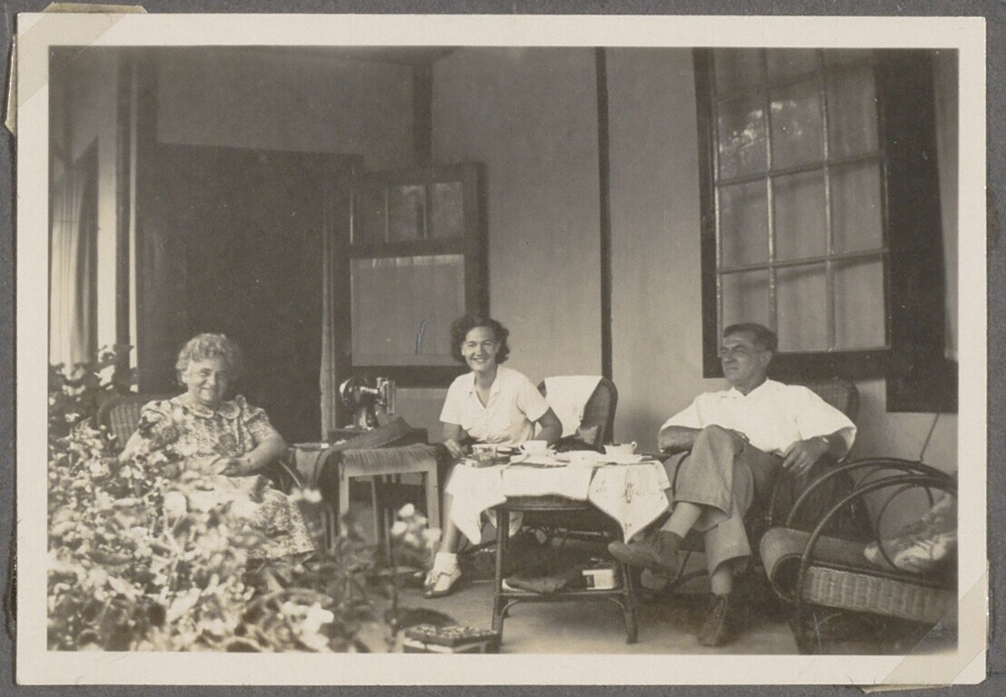 Twee Europese vrouwen en één man op voorgalerij van ...
