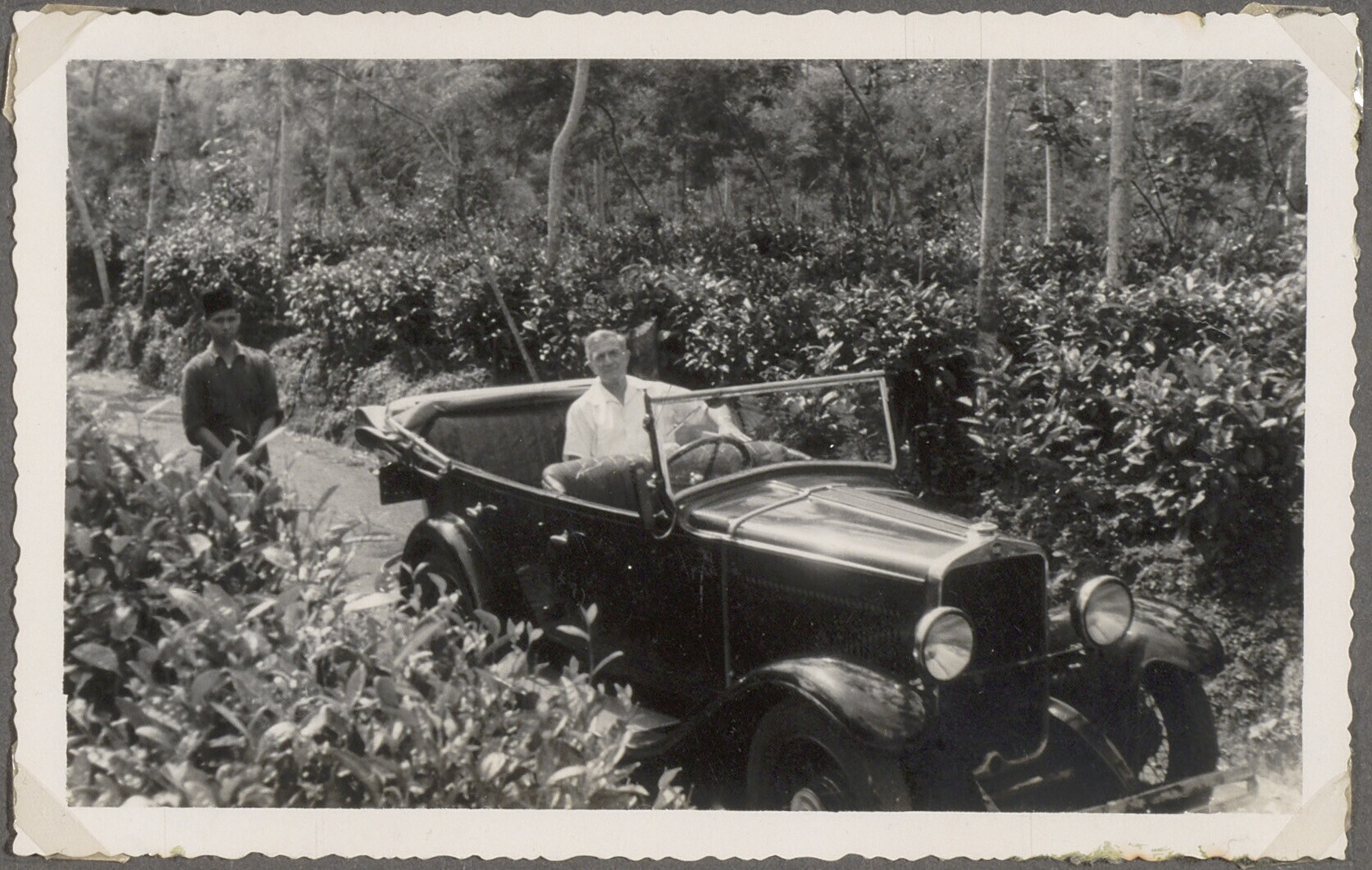 Man in auto bij koffieplantage, de chauffeur staat a...