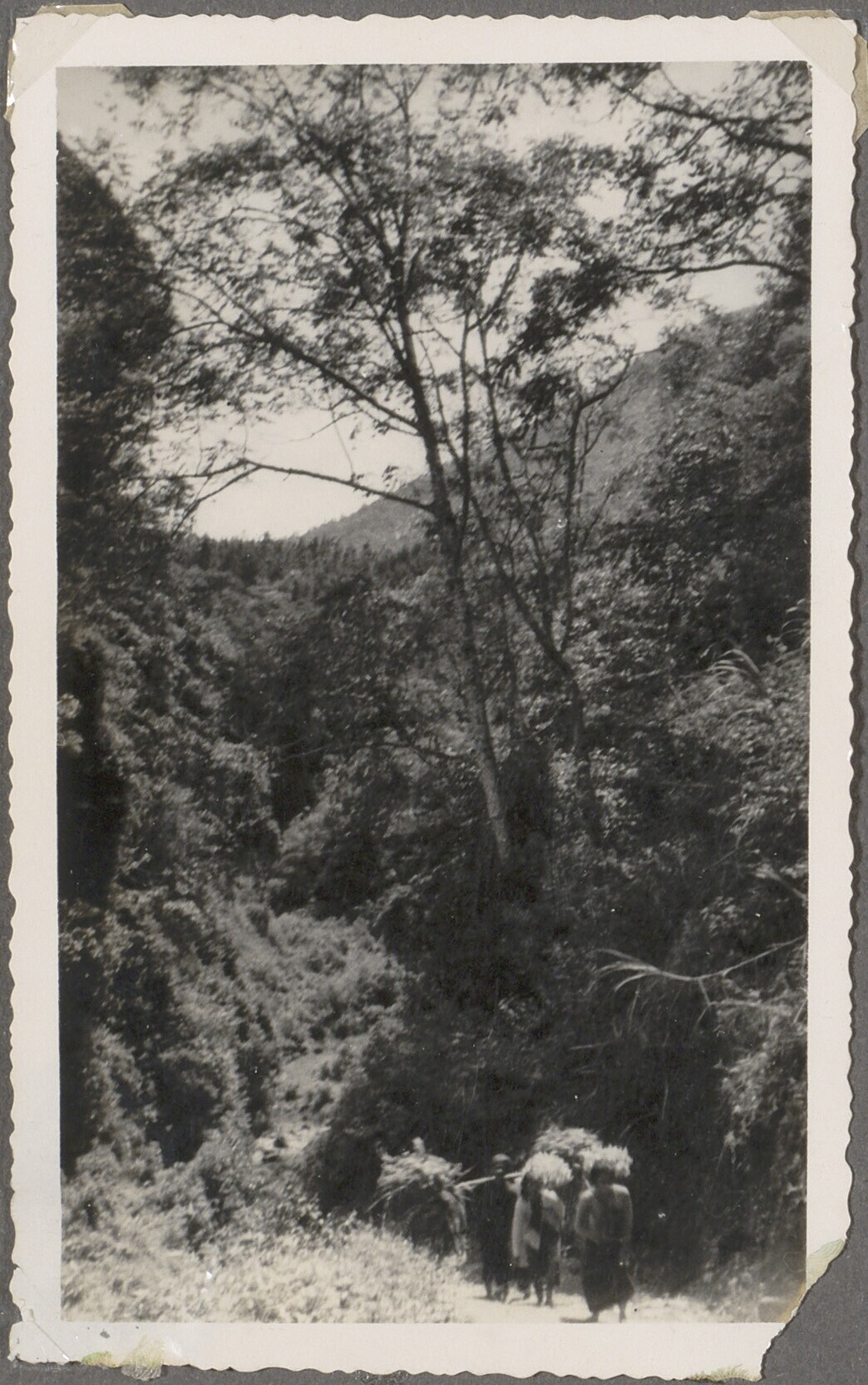 Javaanse mannen en vrouwen sjouwen bundels hout over...