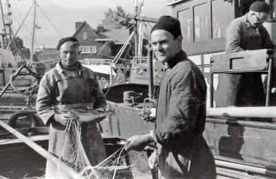 Kapitein Jan Brouwer bezig met zijn netten.